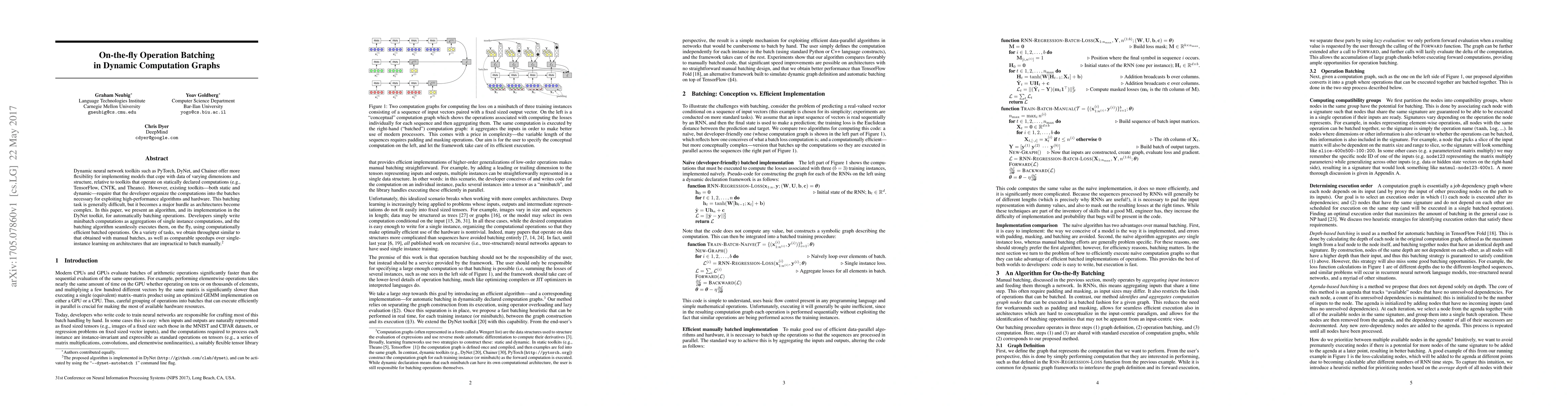This paper introduces an algorithm for on-the-fly operation batching in dynamic computation graphs, implemented in DyNet, to automate the batching process for complex neural network architectures. The approach allows developers to write computations without manual batching, achieving throughput and speedups comparable to manually optimized batches.