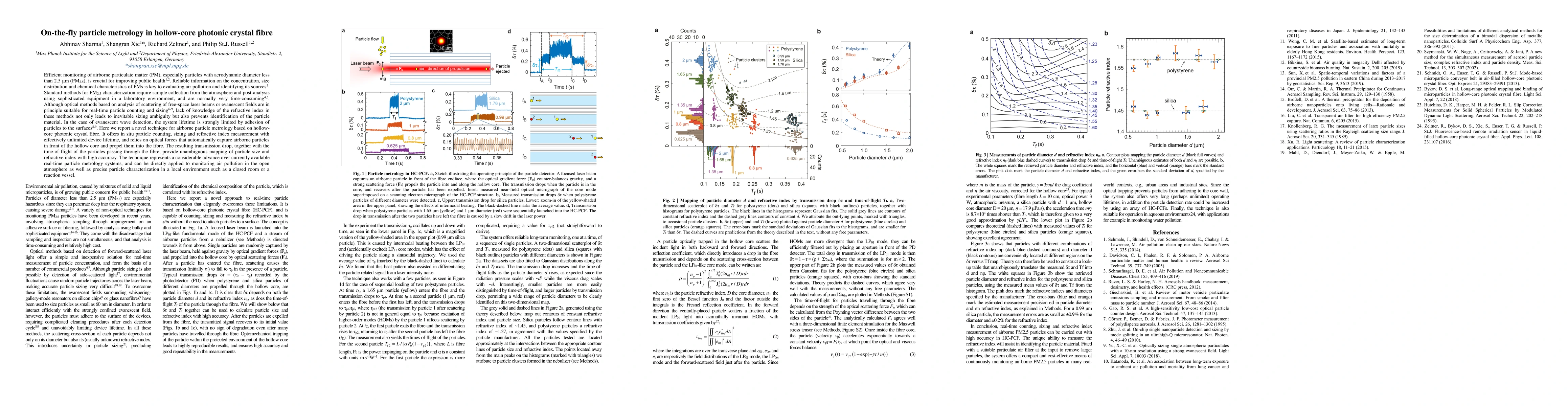 This paper introduces a novel on-the-fly particle metrology technique using hollow-core photonic crystal fibre for real-time monitoring of airborne particulate matter, enabling accurate particle counting, sizing, and refractive index measurement with unlimited device lifetime. This method surpasses current real-time systems by providing precise, in situ characterization of PM2.5 particles.