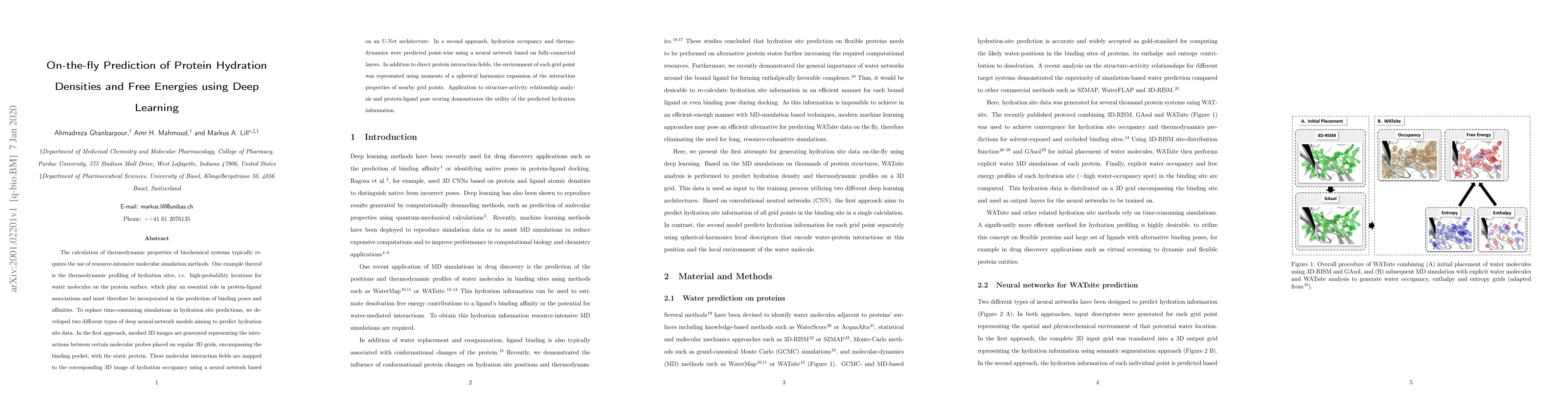 The calculation of thermodynamic properties of biochemical systems typically requires the use of resource-intensive molecular simulation methods. One example thereof is the thermodynamic profiling of hydration sites, i.e. high-probability locations for water molecules on the protein surface, which play an essential role in protein-ligand associations and must therefore be incorporated in the prediction of binding poses and affinities. To replace time-consuming simulations in hydration site predictions, we developed two different types of deep neural-network models aiming to predict hydration site data. In the first approach, meshed 3D images are generated representing the interactions between certain molecular probes placed on regular 3D grids, encompassing the binding pocket, with the static protein. These molecular interaction fields are mapped to the corresponding 3D image of hydration occupancy using a neural network based on an U-Net architecture. In a second approach, hydration occupancy and thermodynamics were predicted point-wise using a neural network based on fully-connected layers. In addition to direct protein interaction fields, the environment of each grid point was represented using moments of a spherical harmonics expansion of the interaction properties of nearby grid points. Application to structure-activity relationship analysis and protein-ligand pose scoring demonstrates the utility of the predicted hydration information.