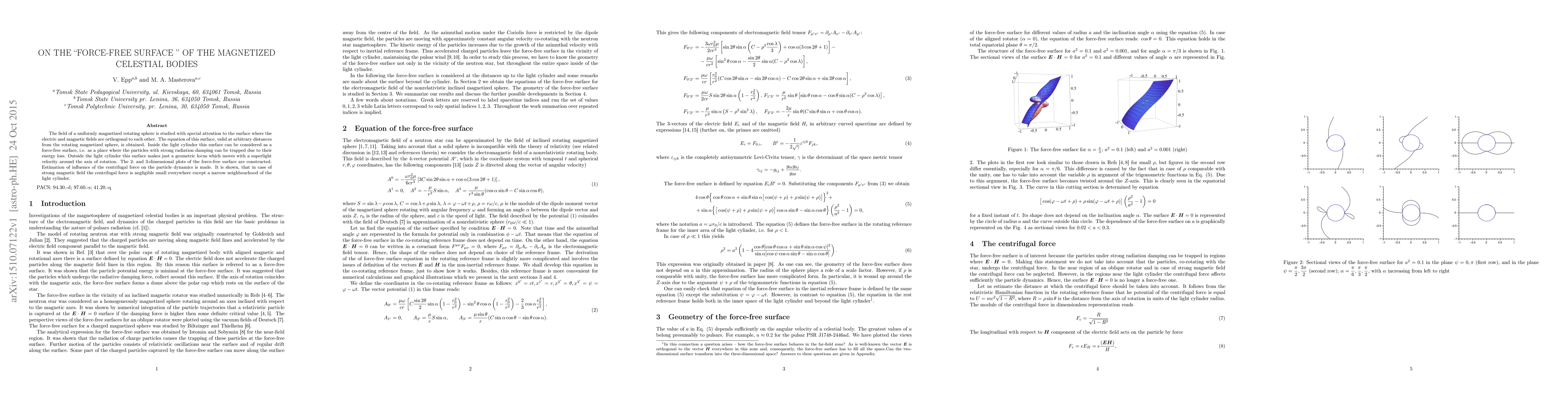 This paper investigates the magnetic field around a uniformly magnetized rotating sphere, focusing on the "force-free surface" where electric and magnetic fields are orthogonal. It derives the equation for this surface at various distances and demonstrates its behavior inside and outside the light cylinder, including the trapping of particles due to energy loss.