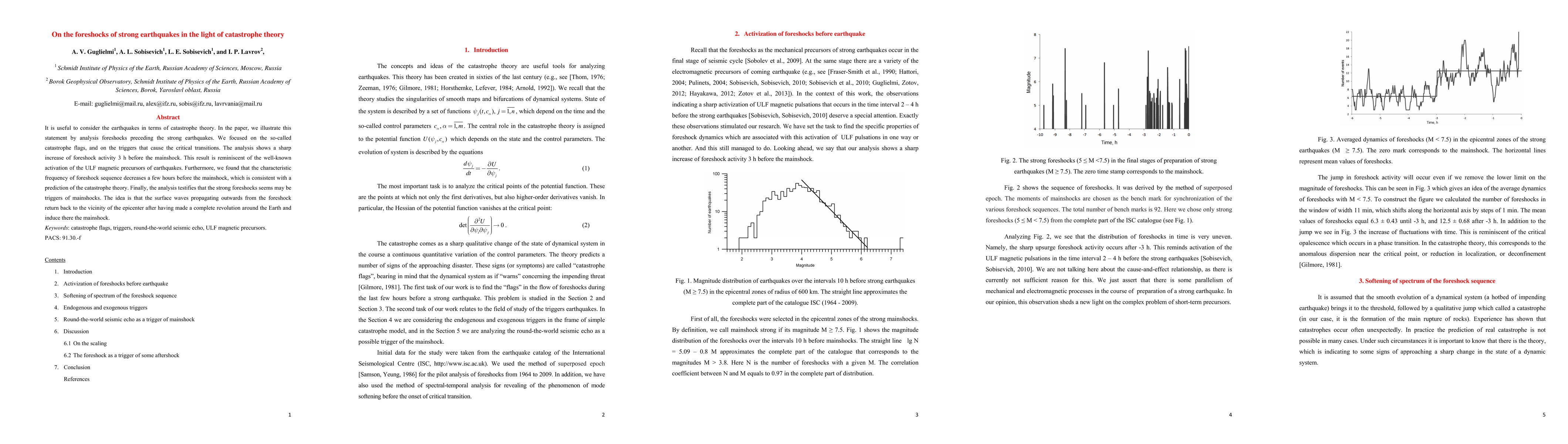 It is useful to consider the earthquakes in terms of catastrophe theory. In the paper, we illustrate this statement by analysis foreshocks preceding the strong earthquakes. We focused on the so-called catastrophe flags, and on the triggers that cause the critical transitions. The analysis shows a sharp increase of foreshock activity 3 h before the mainshock. This result is reminiscent of the well-known activation of the ULF magnetic precursors of earthquakes. Furthermore, we found that the characteristic frequency of foreshock sequence decreases a few hours before the mainshock, which is consistent with a prediction of the catastrophe theory. Finally, the analysis testifies that the strong foreshocks seems may be triggers of mainshocks. The idea is that the surface waves propagating outwards from the foreshock return back to the vicinity of the epicenter after having made a complete revolution around the Earth and induce there the mainshock.