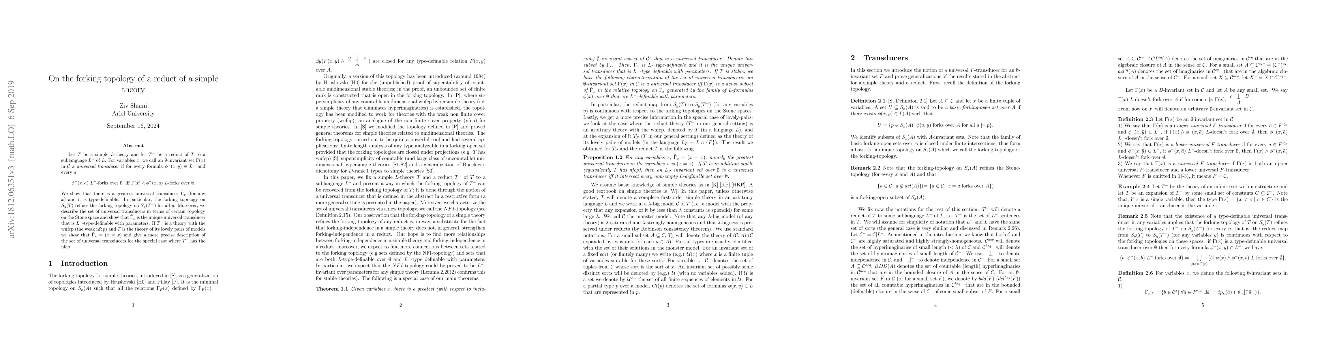 This paper introduces a universal transducer that refines the forking topology on a reduct of a simple theory, showing its existence and type-definability with parameters.