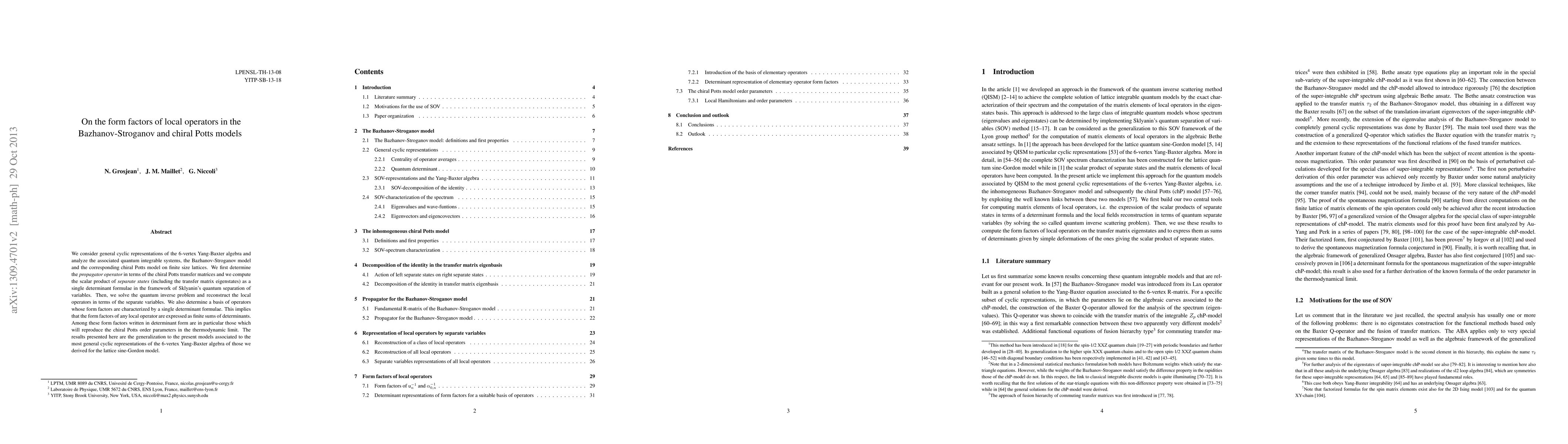 We consider general cyclic representations of the 6-vertex Yang-Baxter algebra and analyze the associated quantum integrable systems, the Bazhanov-Stroganov model and the corresponding chiral Potts model on finite size lattices. We first determine the propagator operator in terms of the chiral Potts transfer matrices and we compute the scalar product of separate states (including the transfer matrix eigenstates) as a single determinant formulae in the framework of Sklyanin's quantum separation of variables. Then, we solve the quantum inverse problem and reconstruct the local operators in terms of the separate variables. We also determine a basis of operators whose form factors are characterized by a single determinant formulae. This implies that the form factors of any local operator are expressed as finite sums of determinants. Among these form factors written in determinant form are in particular those which will reproduce the chiral Potts order parameters in the thermodynamic limit.