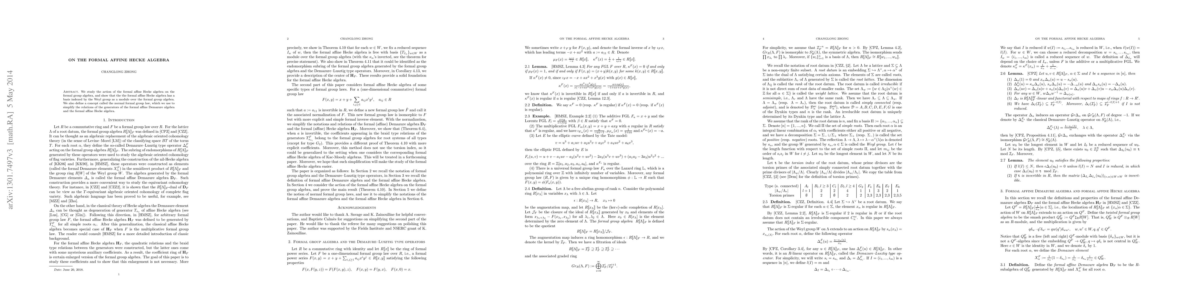 The paper explores the action of the formal affine Hecke algebra on the formal group algebra and demonstrates its basis indexed by the Weyl group. It introduces the normal formal group law to simplify relations in the formal affine Demazure and Hecke algebras.