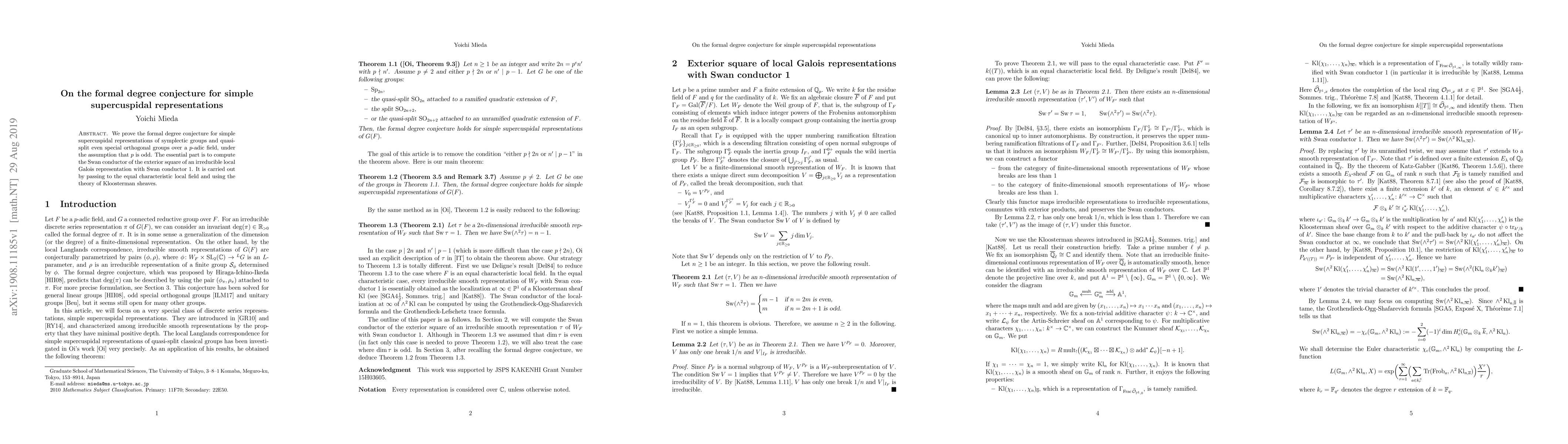 This paper proves the formal degree conjecture for simple supercuspidal representations of symplectic and quasi-split even special orthogonal groups over a p-adic field, assuming p is odd. The key method involves computing the Swan conductor of the exterior square of a specific irreducible local Galois representation using Kloosterman sheaves and passing to an equal characteristic local field.