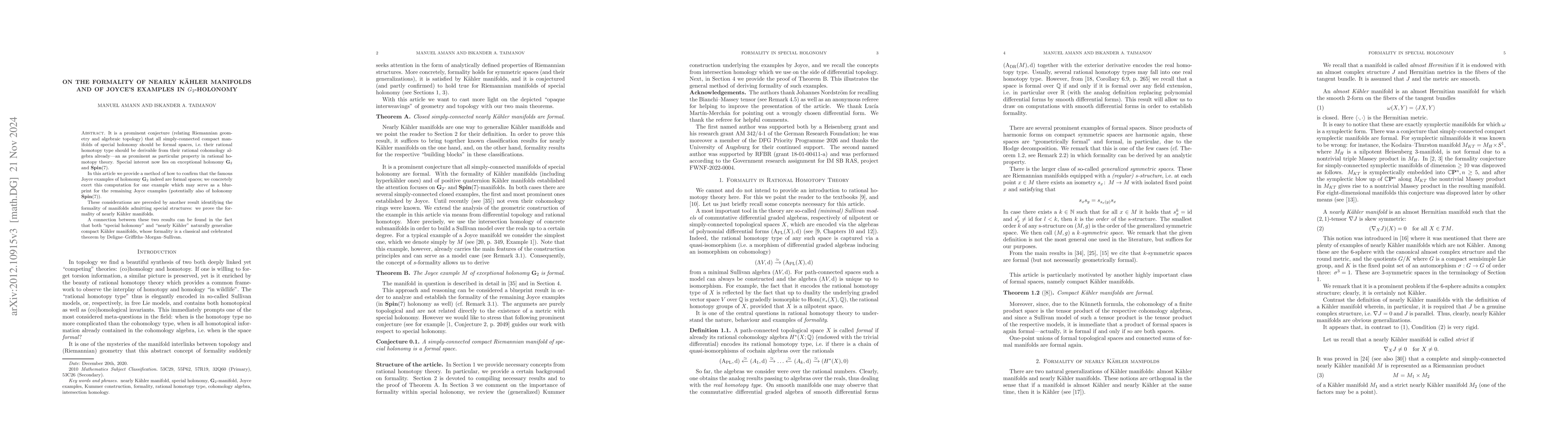 It is a prominent conjecture (relating Riemannian geometry and algebraic topology) that all simply-connected compact manifolds of special holonomy should be formal spaces, i.e., their rational homotopy type should be derivable from their rational cohomology algebra already -- an as prominent as particular property in rational homotopy theory. Special interest now lies on exceptional holonomy $G_2$ and $Spin(7)$. In this article we provide a method of how to confirm that the famous Joyce examples of holonomy $G_2$ indeed are formal spaces; we concretely exert this computation for one example which may serve as a blueprint for the remaining Joyce examples (potentially also of holonomy $Spin(7)$). These considerations are preceded by another result identifying the formality of manifolds admitting special structures: we prove the formality of nearly K\"ahler manifolds. A connection between these two results can be found in the fact that both "special holonomy" and "nearly K\"ahler" naturally generalize compact K\"ahler manifolds, whose formality is a classical and celebrated theorem by Deligne-Griffiths-Morgan-Sullivan.