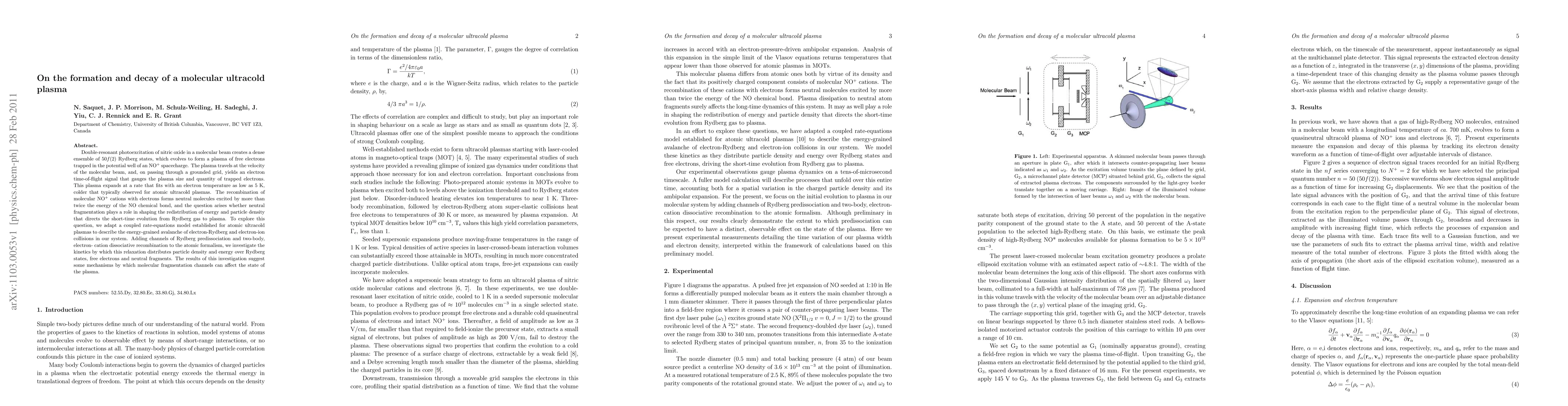 This paper investigates the formation and decay of an ultracold plasma formed from double-resonant photoexcitation of nitric oxide, revealing a plasma colder than typical atomic ultracold plasmas. The study employs a modified rate-equations model to explore the kinetics of energy and particle redistribution, suggesting that molecular fragmentation channels influence the plasma's evolution.