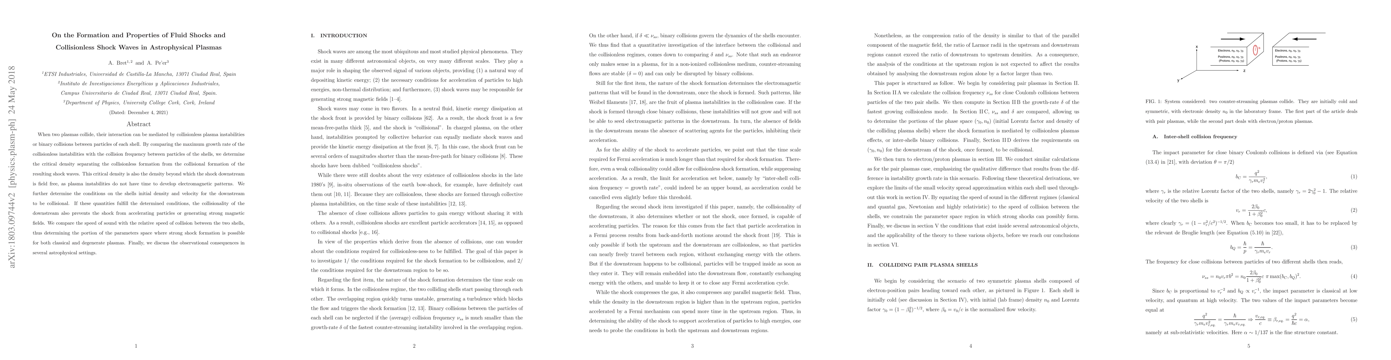 This paper investigates the formation and properties of shock waves in astrophysical plasmas, distinguishing between collisionless and collisional shock formation based on critical density thresholds. It also examines the conditions under which shocks remain collisional and the implications for particle acceleration and magnetic field generation.