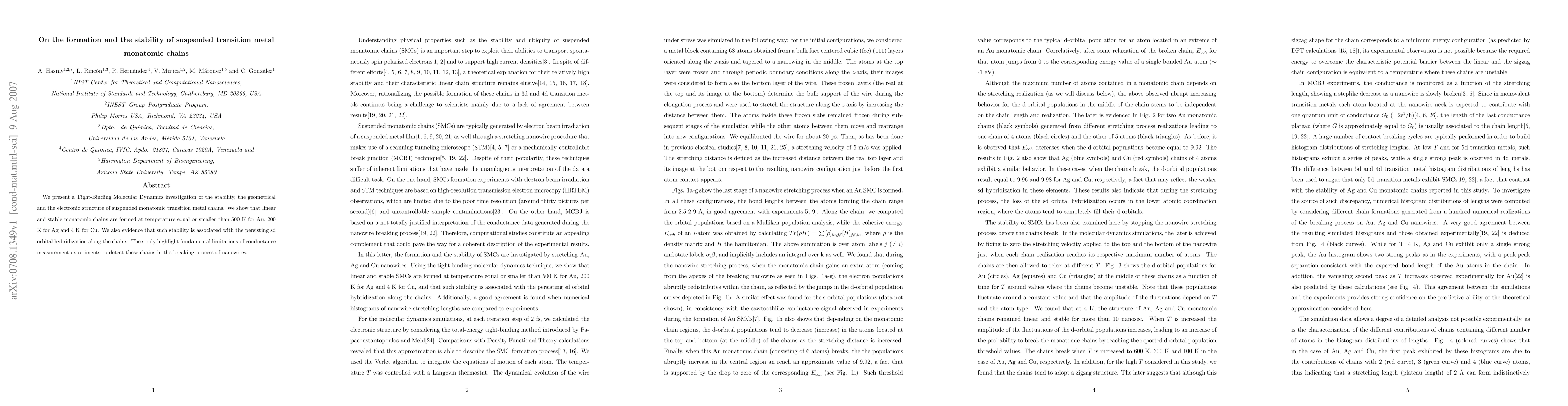 This research investigates the stability and structure of suspended transition metal monatomic chains using Tight-Binding Molecular Dynamics, finding that linear chains form and remain stable at specific low temperatures for Au, Ag, and Cu, with stability linked to sd orbital hybridization. It also notes the challenges in detecting these chains during nanowire breakage via conductance measurements.
