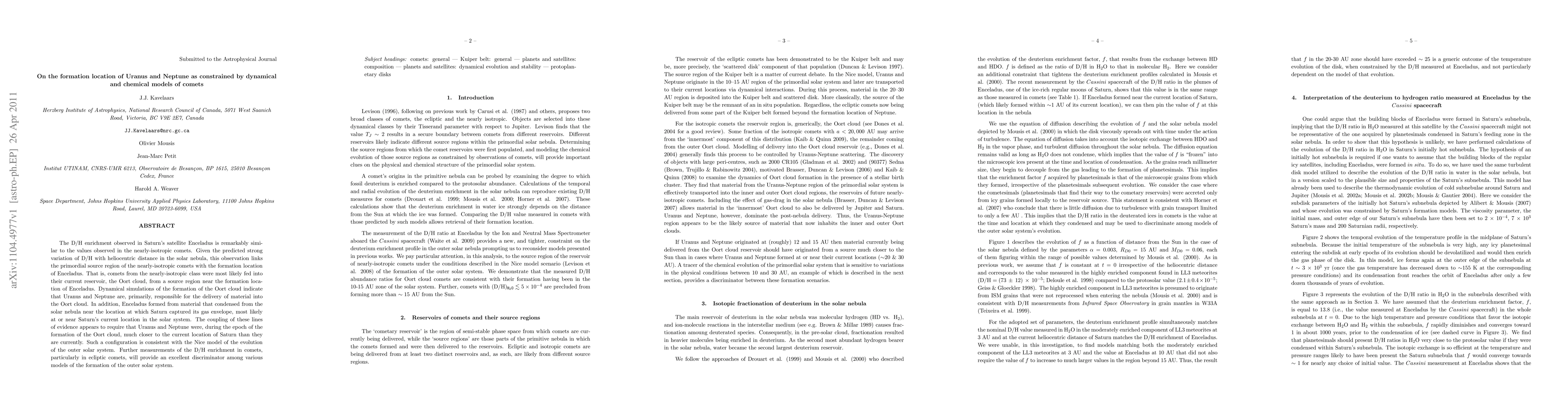 The research links the source of nearly-isotropic comets with the formation location of Saturn's moon Enceladus, both having similar deuterium-to-hydrogen (D/H) ratios. Dynamical simulations suggest Uranus and Neptune were closer to Saturn's location during the Oort cloud's formation, aligning with the Nice model of the solar system's evolution. Future D/H measurements in comets could refine models of outer solar system formation.