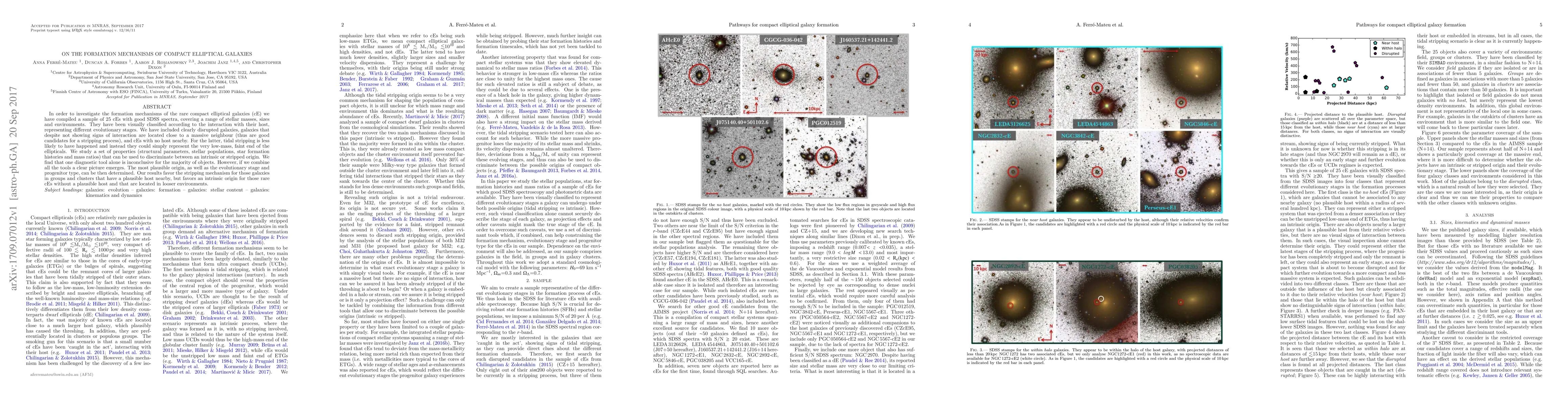 Research identifies that compact elliptical galaxies can form through stripping mechanisms from their host galaxy in groups and clusters, but are more likely to have an intrinsic origin without a nearby host.