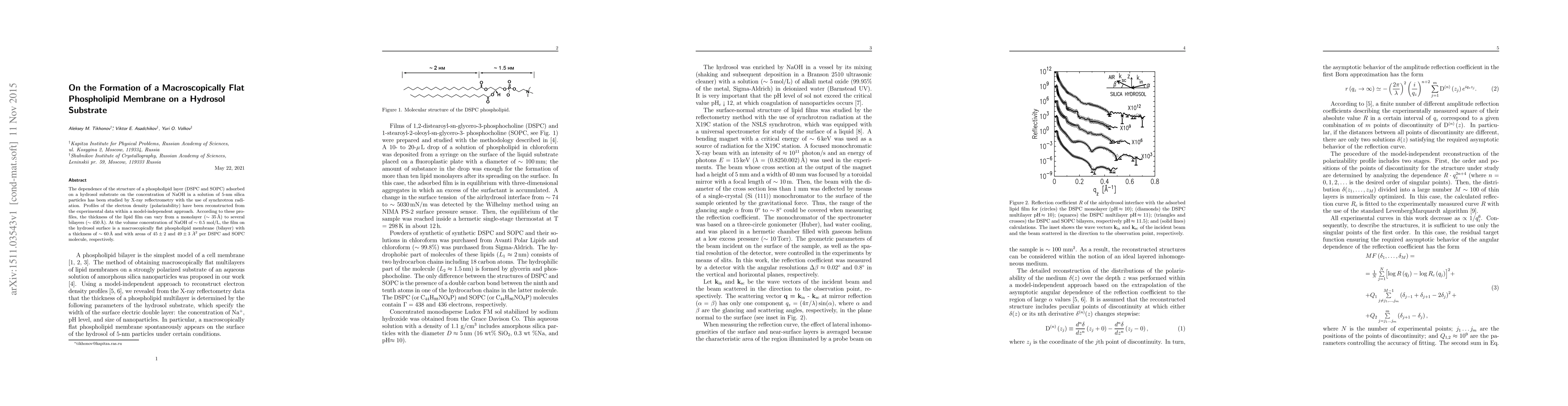 This study investigates the formation of a macroscopically flat phospholipid membrane on a hydrosol substrate using X-ray reflectrometry. At a NaOH concentration of ~0.5 mol/L, the phospholipid bilayer (DSPC and SOPC) forms a flat membrane with a thickness of ~60 Angstrom and specific molecular areas.