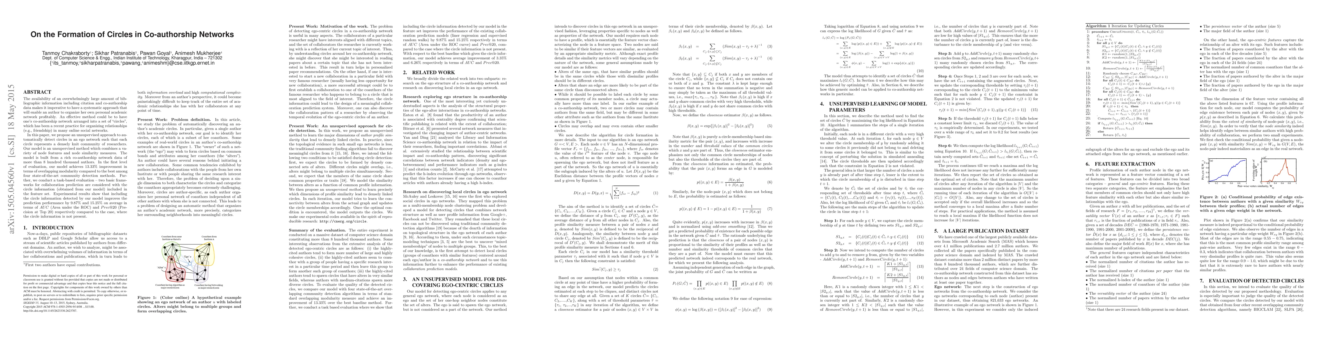 This paper proposes an unsupervised method to automatically detect "circles" in co-authorship networks, representing densely knit communities. The model, evaluated against state-of-the-art methods, shows a 13.33% improvement in overlapping modularity and enhances collaboration prediction by 9.87% in AUC and 15.25% in P rec@20 when circle information is used.
