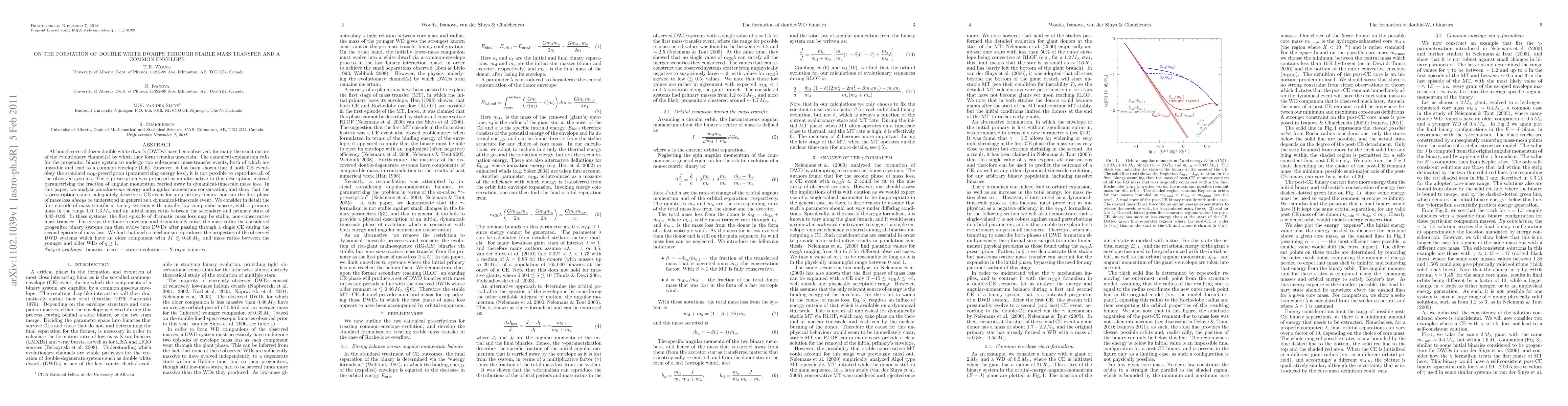 Although several dozen double white dwarfs (DWDs) have been observed, for many the exact nature of the evolutionary channel(s) by which they form remains uncertain. The canonical explanation calls for the progenitor binary system to undergo two subsequent mass-transfer events, both of which are unstable and lead to a common envelope (CE). However, it has been shown that if both CE events obey the standard alpha-prescription (parametrizing energy loss), it is not possible to reproduce all of the observed systems. The gamma-prescription was proposed as an alternative to this description, instead parametrizing the fraction of angular momentum carried away in dynamical-timescale mass loss. In this paper, we analyze simultaneous energy and angular-momentum conservation, and show that the gamma-prescription cannot adequately describe a CE event for an arbitrary binary, nor can the first phase of mass loss always be understood in general as a dynamical-timescale event. We consider in detail the first episode of mass transfer in binary systems with initially low companion masses, with a primary mass in the range 1.0--1.3 solar masses and an initial mass ratio between the secondary and primary stars of 0.83--0.92. In these systems, the first episode of dramatic mass loss may be stable, non-conservative mass transfer. This strips the donor's envelope and dramatically raises the mass ratio; the considered progenitor binary systems can then evolve into DWDs after passing through a single CE during the second episode of mass loss. We find that such a mechanism reproduces the properties of the observed DWD systems which have an older component with less than approximately 0.46 solar masses and mass ratios between the younger and older WDs greater than 1.