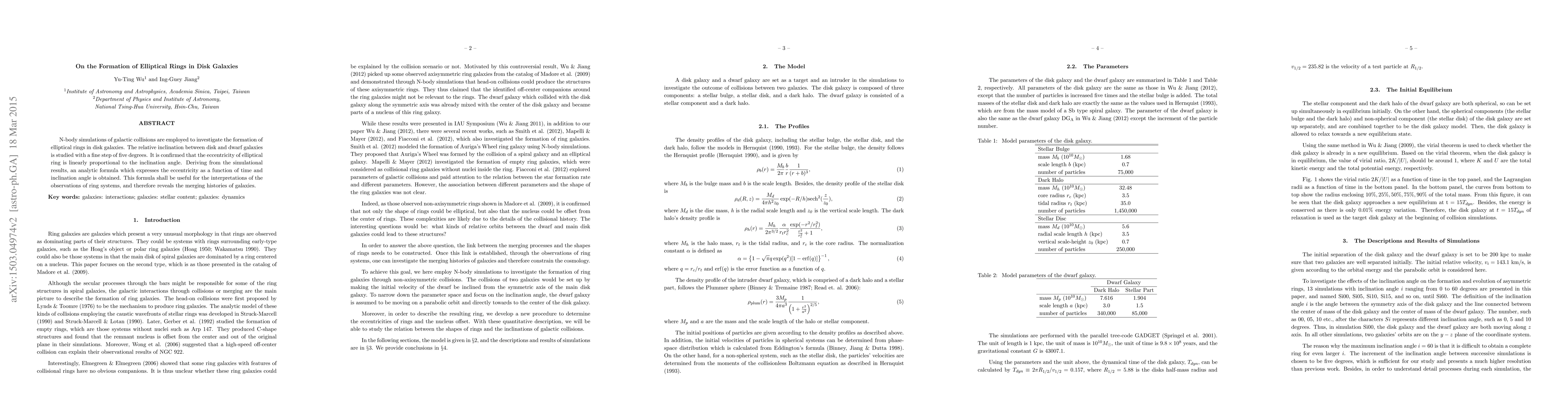 N-body simulations of galactic collisions are employed to investigate the formation of elliptical rings in disk galaxies. The relative inclination between disk and dwarf galaxies is studied with a fine step of five degrees. It is confirmed that the eccentricity of elliptical ring is linearly proportional to the inclination angle. Deriving from the simulational results, an analytic formula which expresses the eccentricity as a function of time and inclination angle is obtained. This formula shall be useful for the interpretations of the observations of ring systems, and therefore reveals the merging histories of galaxies.