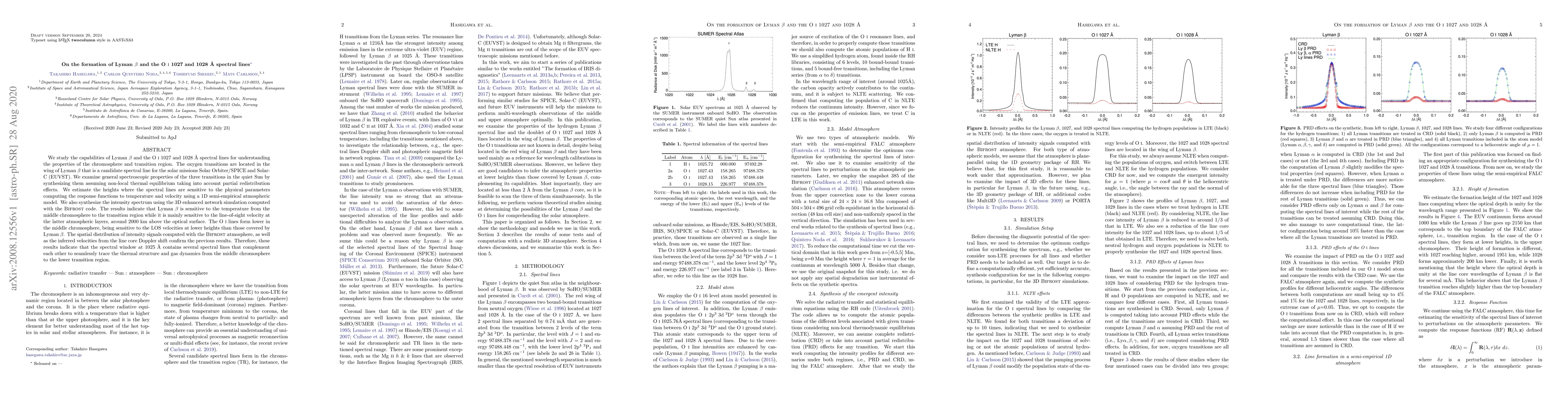 We study the capabilities of Lyman $\beta$ and the O I 1027 and 1028 \AA\ spectral lines for understanding the properties of the chromosphere and transition region. The oxygen transitions are located in the wing of Lyman $\beta$ that is a candidate spectral line for the solar missions Solar Orbiter/SPICE and Solar-C (EUVST). We examine general spectroscopic properties of the three transitions in the quiet Sun by synthesizing them assuming non-local thermal equilibrium taking into account partial redistribution effects. We estimate the heights where the spectral lines are sensitive to the physical parameters computing the response functions to temperature and velocity using a 1D semi-empirical atmospheric model. We also synthesize the intensity spectrum using the 3D enhanced network simulation computed with the BIFROST code. The results indicate that Lyman $\beta$ is sensitive to the temperature from the middle chromosphere to the transition region while it is mainly sensitive to the line-of-sight velocity at the latter atmospheric layers, around 2000 km above the optical surface. The O I lines form lower in the middle chromosphere, being sensitive to the LOS velocities at lower heights than those covered by Lyman $\beta$. The spatial distribution of intensity signals computed with the BIFROST atmosphere, as well as the inferred velocities from the line core Doppler shift confirm the previous results. Therefore, these results indicate that the spectral window at 1025 \AA\ contains several spectral lines that complement each other to seamlessly trace the thermal structure and gas dynamics from the middle chromosphere to the lower transition region.