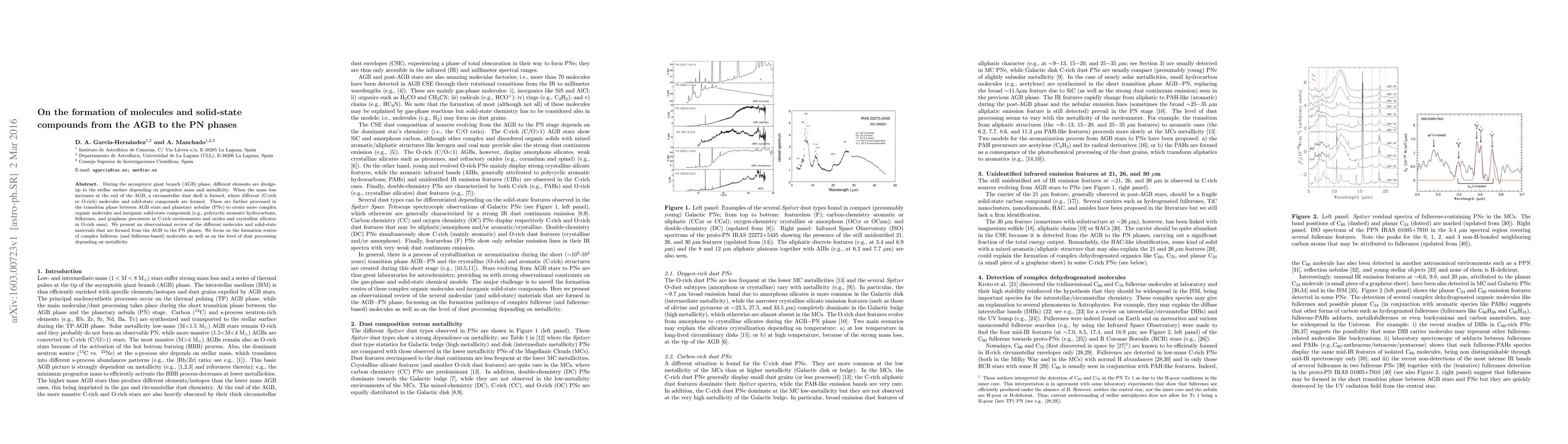 During the asymptoyic giant branch (AGB) phase, different elements are dredge-up to the stellar surface depending on progenitor mass and metallicity. When the mass loss increases at the end of the AGB, a circumstellar dust shell is formed, where different (C-rich or O-rich) molecules and solid-state compounds are formed. These are further processed in the transition phase between AGB stars and planetary nebulae (PNe) to create more complex organic molecules and inorganic solid-state compounds (e.g., polycyclic aromatic hydrocarbons, fullerenes, and graphene precursors in C-rich environments and oxides and crystalline silicates in O-rich ones). We present an observational review of the different molecules and solid-state materials that are formed from the AGB to the PN phases. We focus on the formation routes of complex fullerene (and fullerene-based) molecules as well as on the level of dust processing depending on metallicity.
