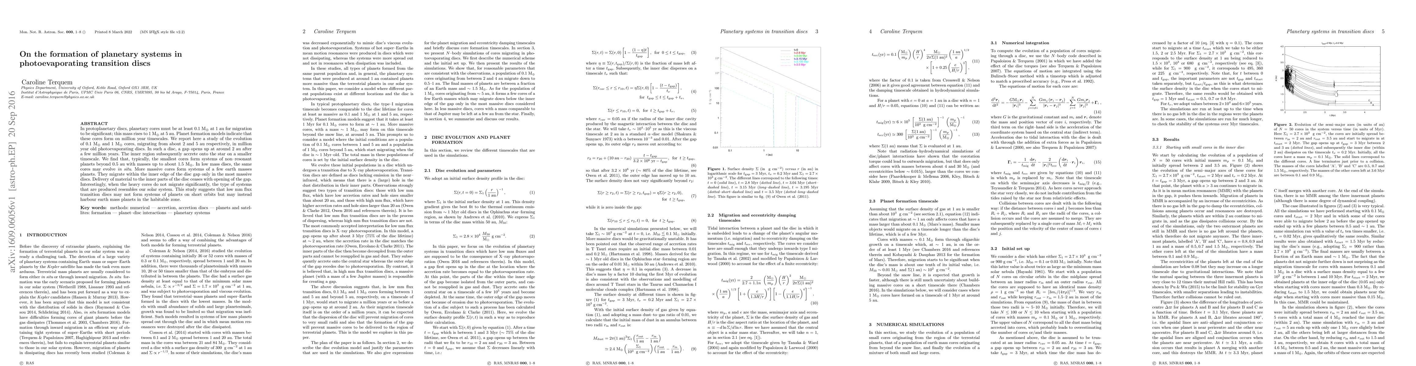 In protoplanetary discs, planetary cores must be at least 0.1 earth mass at 1 au for migration to be significant; this mass rises to 1 earth mass at 5 au. Planet formation models indicate that these cores form on million year timescales. We report here a study of the evolution of 0.1 earth mass and 1 earth mass cores, migrating from about 2 and 5 au respectively, in million year old photoevaporating discs. In such a disc, a gap opens up at around 2 au after a few million years. The inner region subsequently accrete onto the star on a smaller timescale. We find that, typically, the smallest cores form systems of non-resonant planets beyond 0.5 au with masses up to about 1.5 earth mass. In low mass discs, the same cores may evolve in situ. More massive cores form systems of a few earth masses planets. They migrate within the inner edge of the disc gap only in the most massive discs. Delivery of material to the inner parts of the disc ceases with opening of the gap. Interestingly, when the heavy cores do not migrate significantly, the type of systems that are produced resembles our solar system. This study suggests that low mm flux transition discs may not form systems of planets on short orbits but may instead harbour earth mass planets in the habitable zone.
