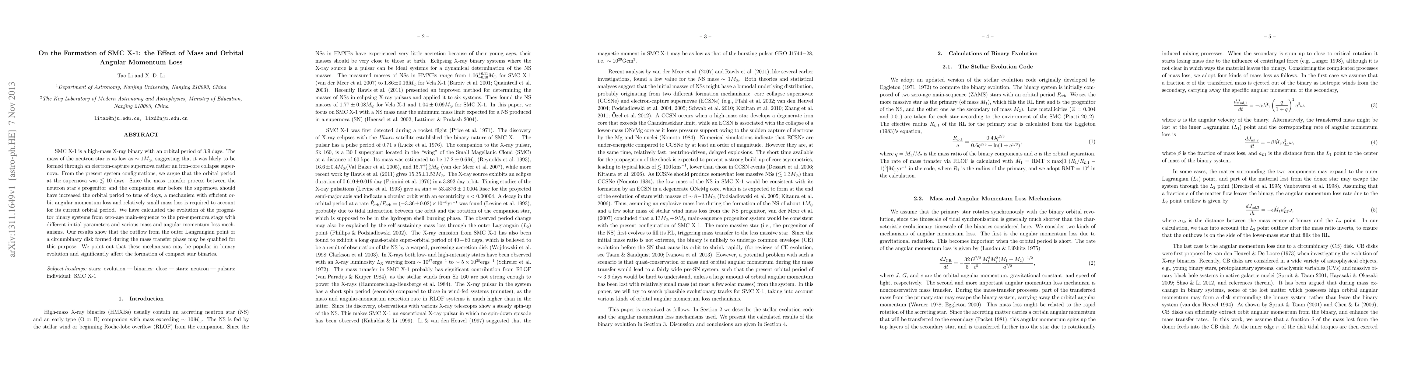 SMC X-1 is a high-mass X-ray binary with an orbital period of 3.9 days. The mass of the neutron star is as low as $\sim 1 M_{\sun}$, suggesting that it was likely to be formed through an electron-capture supernova rather an iron-core collapse supernova. From the present system configurations, we argue that the orbital period at the supernova was $\lesssim 10$ days. Since the mass transfer process between the neutron star's progenitor and the companion star before the supernova should have increased the orbital period to tens of days, a mechanism with efficient orbit angular momentum loss and relatively small mass loss is required to account for its current orbital period. We have calculated the evolution of the progenitor binary systems from zero-age main-sequence to the pre-supernova stage with different initial parameters and various mass and angular momentum loss mechanisms. Our results show that the outflow from the outer Langrangian point or a circumbinary disk formed during the mass transfer phase may be qualified for this purpose. We point out that these mechanisms may be popular in binary evolution and significantly affect the formation of compact star binaries.