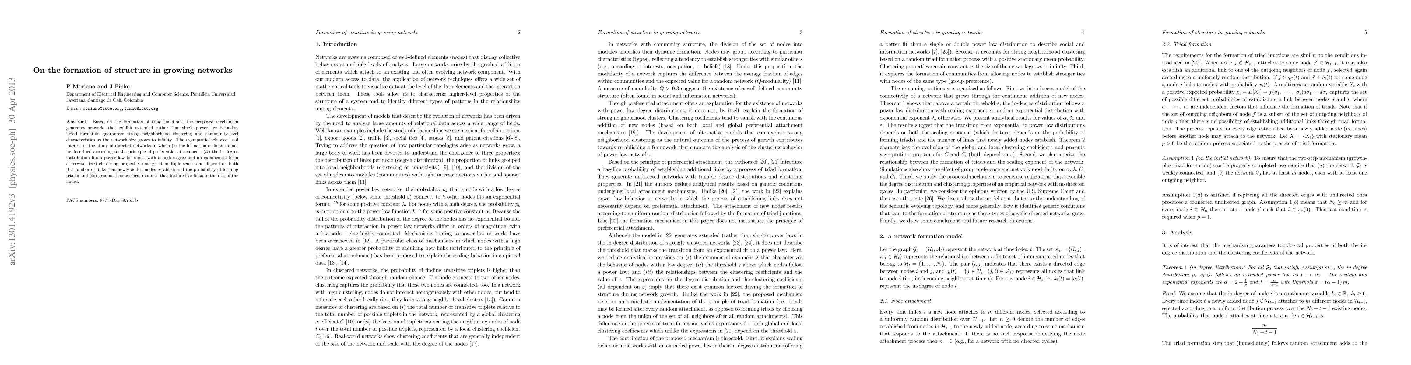Based on the formation of triad junctions, the proposed mechanism generates networks that exhibit extended rather than single power law behavior. Triad formation guarantees strong neighborhood clustering and community-level characteristics as the network size grows to infinity. The asymptotic behavior is of interest in the study of directed networks in which (i) the formation of links cannot be described according to the principle of preferential attachment; (ii) the in-degree distribution fits a power law for nodes with a high degree and an exponential form otherwise; (iii) clustering properties emerge at multiple scales and depend on both the number of links that newly added nodes establish and the probability of forming triads; and (iv) groups of nodes form modules that feature less links to the rest of the nodes.