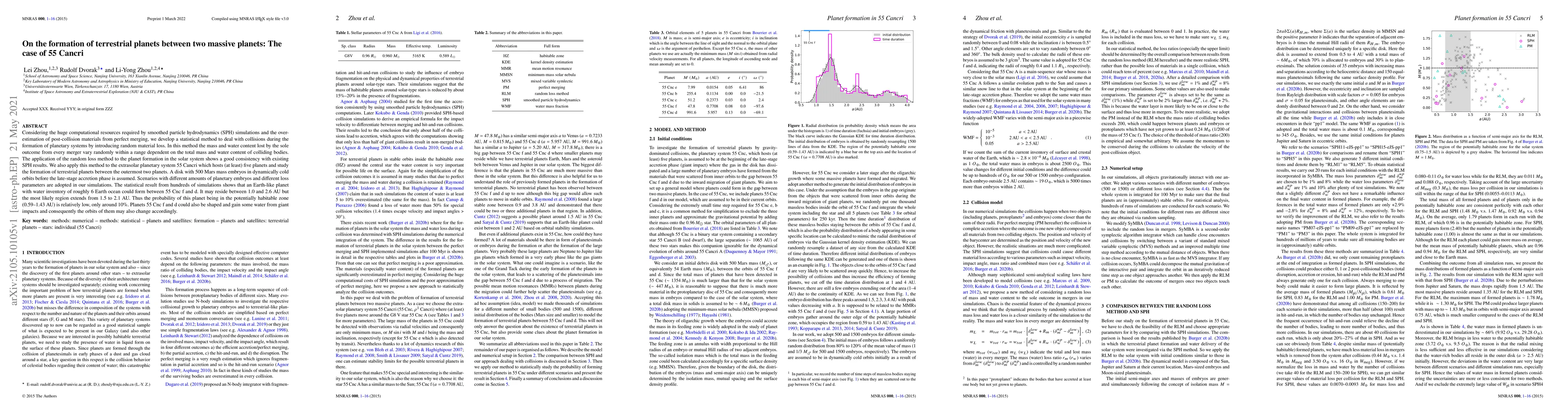 Considering the huge computational resources required by smoothed particle hydrodynamics (SPH) simulations and the overestimation of post-collision materials from perfect merging, we develop a statistical method to deal with collisions during the formation of planetary systems by introducing random material loss. In this method the mass and water content lost by the sole outcome from every merger vary randomly within a range dependent on the total mass and water content of colliding bodies. The application of the random loss method to the planet formation in the solar system shows a good consistency with existing SPH results. We also apply this method to the extrasolar planetary system 55 Cancri which hosts (at least) five planets and study the formation of terrestrial planets between the outermost two planets. A disk with 500 Mars mass embryos in dynamically cold orbits before the late-stage accretion phase is assumed. Scenarios with different amounts of planetary embryos and different loss parameters are adopted in our simulations. The statistical result from hundreds of simulations shows that an Earth-like planet with water inventory of roughly 6 Earth ocean could form between 55 Cnc f and d. It may reside between 1.0 and 2.6 AU but the most likely region extends from 1.5 to 2.1 AU. Thus the probability of this planet being in the potentially habitable zone (0.59--1.43 AU) is relatively low, only around 10\%. Planets 55 Cnc f and d could also be shaped and gain some water from giant impacts and consequently the orbits of them may also change accordingly.