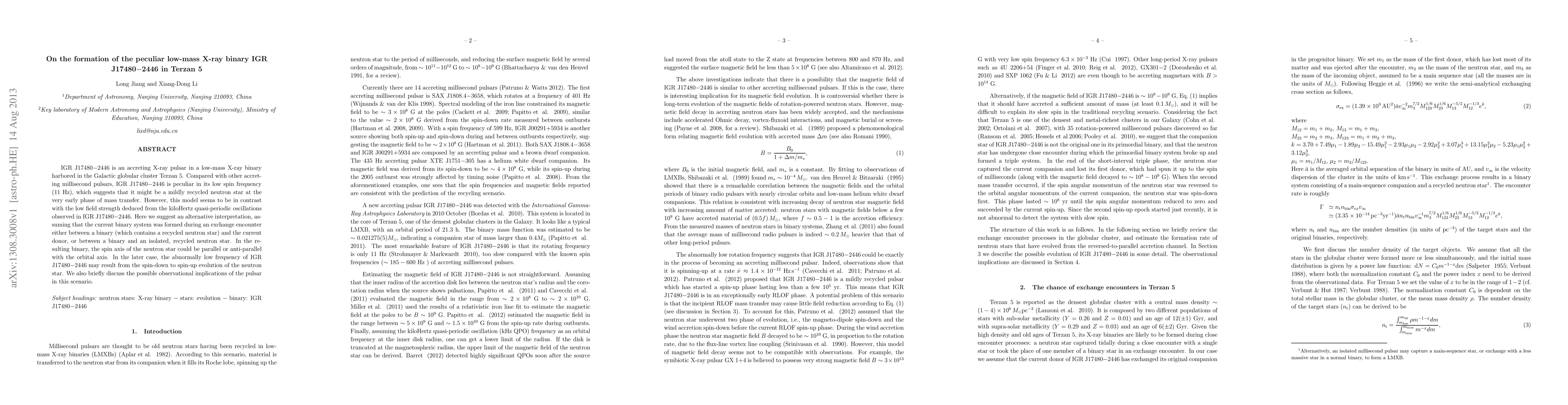 IGR J17480$-$2446 is an accreting X-ray pulsar in a low-mass X-ray binary harbored in the Galactic globular cluster Terzan 5. Compared with other accreting millisecond pulsars, IGR J17480$-$2446 is peculiar in its low spin frequency (11 Hz), which suggests that it might be a mildly recycled neutron star at the very early phase of mass transfer. However, this model seems to be in contrast with the low field strength deduced from the kiloHertz quasi-periodic oscillations observed in IGR J17480$-$2446. Here we suggest an alternative interpretation, assuming that the current binary system was formed during an exchange encounter either between a binary (which contains a recycled neutron star) and the current donor, or between a binary and an isolated, recycled neutron star. In the resulting binary, the spin axis of the neutron star could be parallel or anti-parallel with the orbital axis. In the later case, the abnormally low frequency of IGR J17480$-$2446 may result from the spin-down to spin-up evolution of the neutron star. We also briefly discuss the possible observational implications of the pulsar in this scenario.
