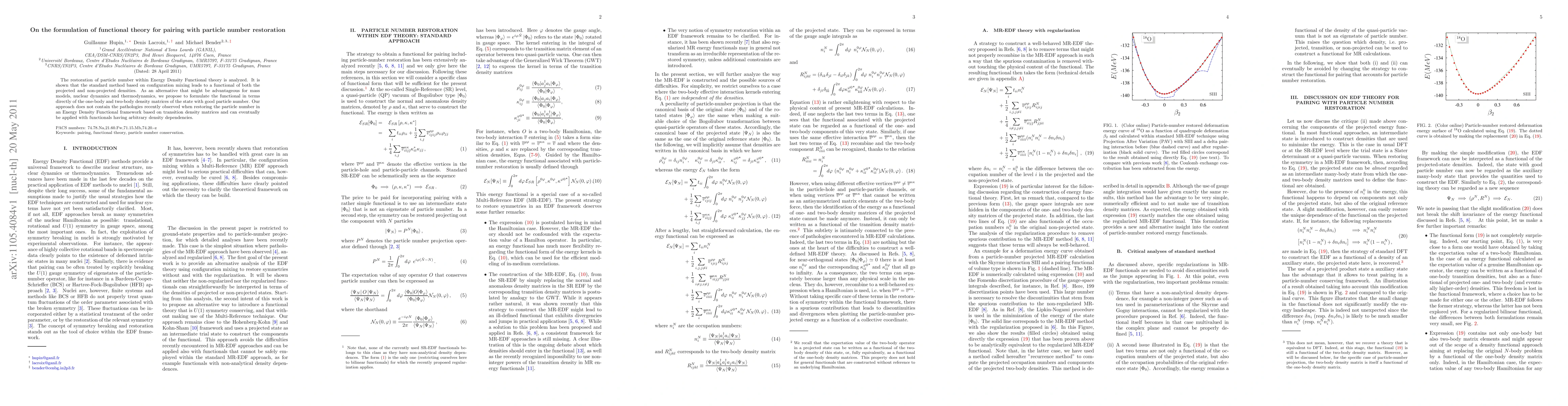 The restoration of particle number within Energy Density Functional theory is analyzed. It is shown that the standard method based on configuration mixing leads to a functional of both the projected and non-projected densities. As an alternative that might be advantageous for mass models, nuclear dynamics and thermodynamics, we propose to formulate the functional in terms directly of the one-body and two-body density matrices of the state with good particle number. Our approach does not contain the pathologies recently observed when restoring the particle number in an Energy Density Functional framework based on transition density matrices and can eventually be applied with functionals having arbitrary density dependencies.