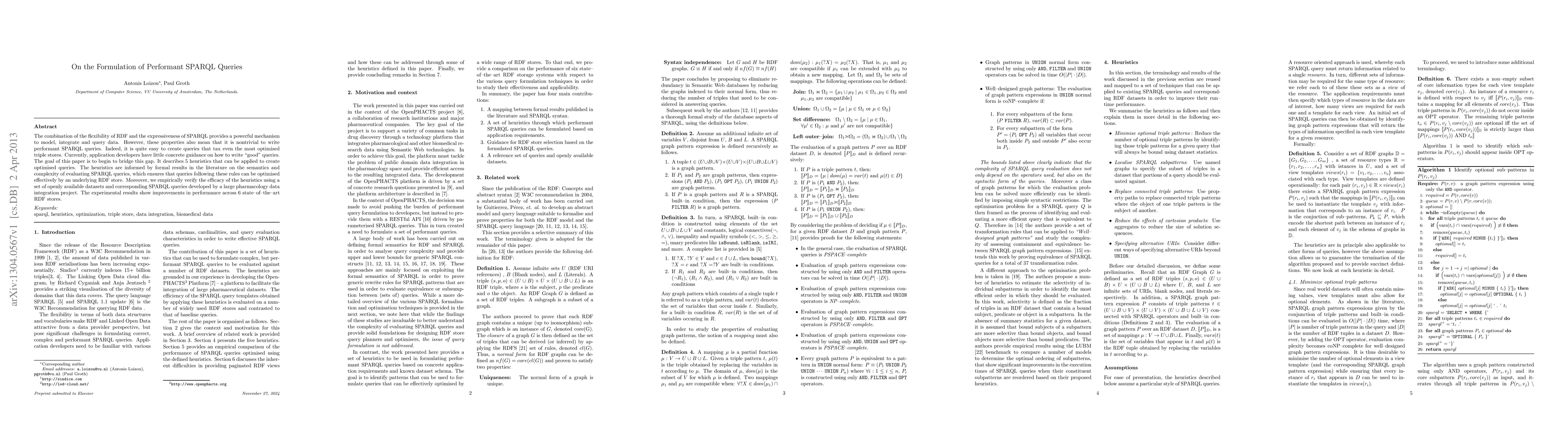 This paper proposes five heuristics for writing performant SPARQL queries, grounded in formal results on query semantics and complexity. Empirical testing on datasets from a pharmacology project demonstrates significant performance improvements across six RDF stores.