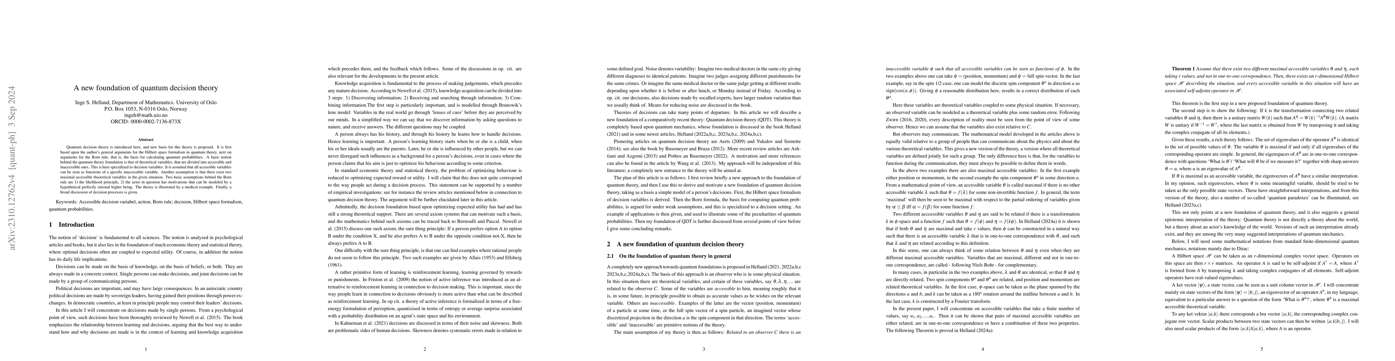 The paper presents a new theoretical foundation for quantum decision theory, integrating concepts from quantum mechanics with decision-making models, and provides a justification for Born's rule within this context.