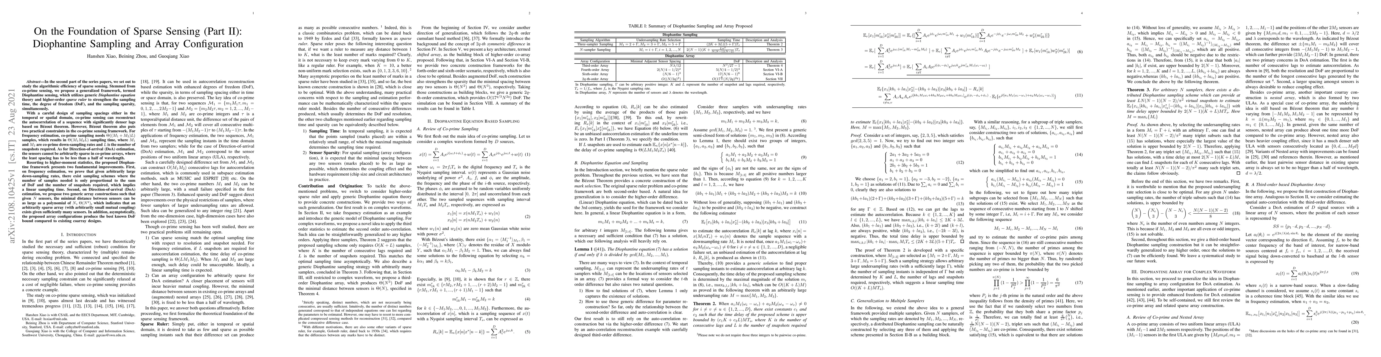 In the second part of the series papers, we set out to study the algorithmic efficiency of sparse sensing. Stemmed from co-prime sensing, we propose a generalized framework, termed Diophantine sensing, which utilizes generic Diophantine equation theory and higher-order sparse ruler to strengthen the sampling time, the degree of freedom (DoF), and the sampling sparsity, simultaneously. Resorting to higher-moment statistics, the proposed Diophantine framework presents two fundamental improvements. First, on frequency estimation, we prove that given arbitrarily large down-sampling rates, there exist sampling schemes where the number of samples needed is only proportional to the sum of DoF and the number of snapshots required, which implies a linear sampling time. Second, on Direction-of-arrival (DoA) estimation, we propose two generic array constructions such that given N sensors, the minimal distance between sensors can be as large as a polynomial of N, O(N^q), which indicates that an arbitrarily sparse array (with arbitrarily small mutual coupling) exists given sufficiently many sensors. In addition, asymptotically, the proposed array configurations produce the best known DoF bound compared to existing sparse array designs.