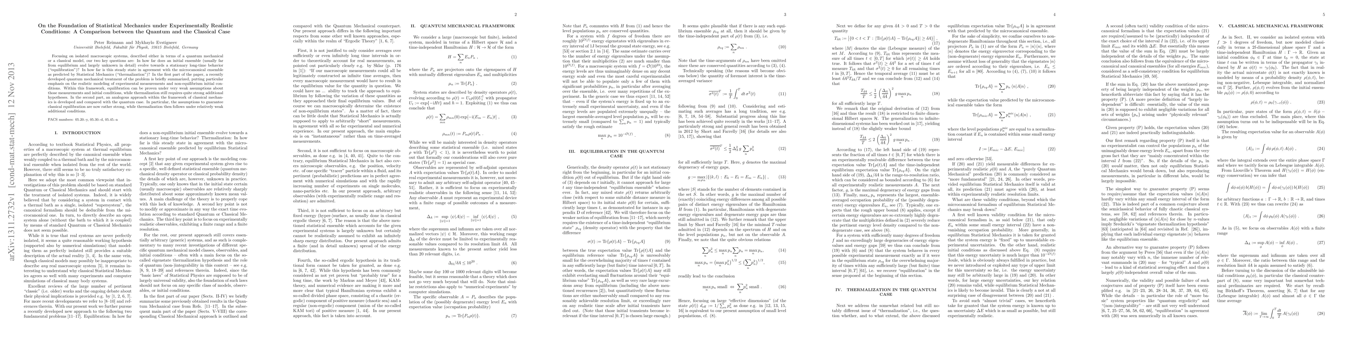 This paper investigates the processes of equilibration and thermalization in isolated macroscopic systems modeled either classically or quantum mechanically, under realistic experimental conditions. It finds that quantum systems equilibrate under weak assumptions, while thermalization requires stronger conditions, contrasting with classical systems where equilibration demands stronger assumptions but thermalization follows more easily.