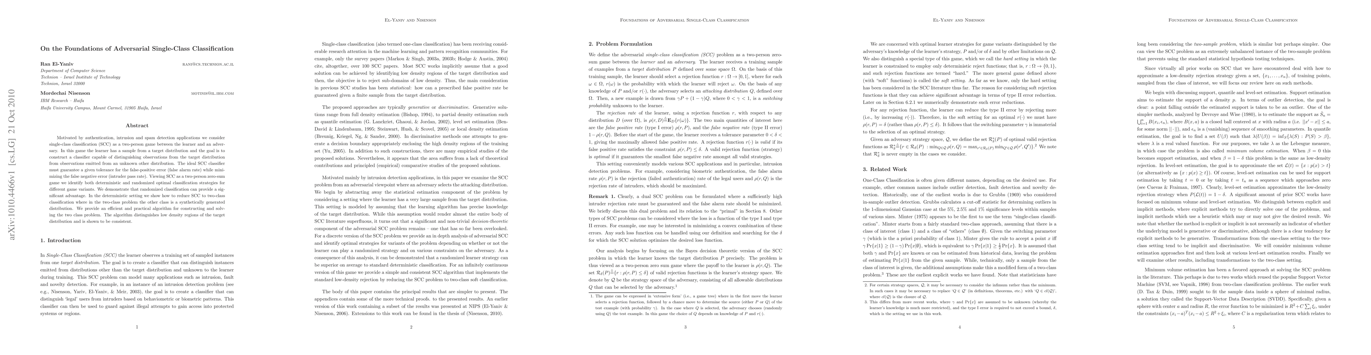 Motivated by authentication, intrusion and spam detection applications we consider single-class classification (SCC) as a two-person game between the learner and an adversary. In this game the learner has a sample from a target distribution and the goal is to construct a classifier capable of distinguishing observations from the target distribution from observations emitted from an unknown other distribution. The ideal SCC classifier must guarantee a given tolerance for the false-positive error (false alarm rate) while minimizing the false negative error (intruder pass rate). Viewing SCC as a two-person zero-sum game we identify both deterministic and randomized optimal classification strategies for different game variants. We demonstrate that randomized classification can provide a significant advantage. In the deterministic setting we show how to reduce SCC to two-class classification where in the two-class problem the other class is a synthetically generated distribution. We provide an efficient and practical algorithm for constructing and solving the two class problem. The algorithm distinguishes low density regions of the target distribution and is shown to be consistent.
