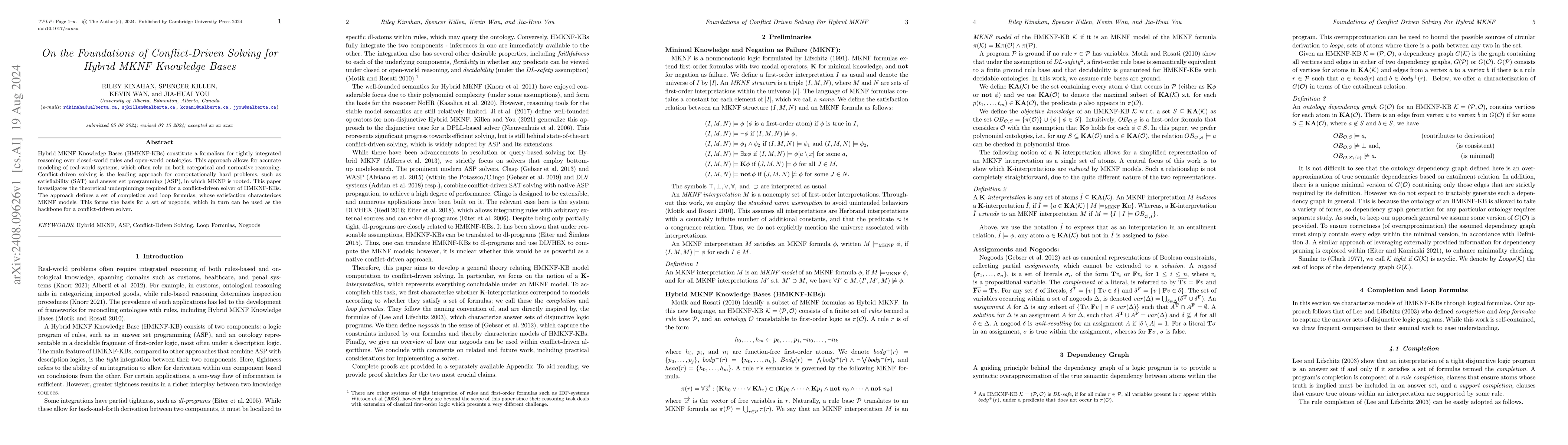 This paper explores the theoretical foundations for a conflict-driven solver for Hybrid MKNF Knowledge Bases, defining completion and loop formulas that characterize MKNF models and serve as the basis for conflict-driven solving in computationally hard problems like SAT and ASP.