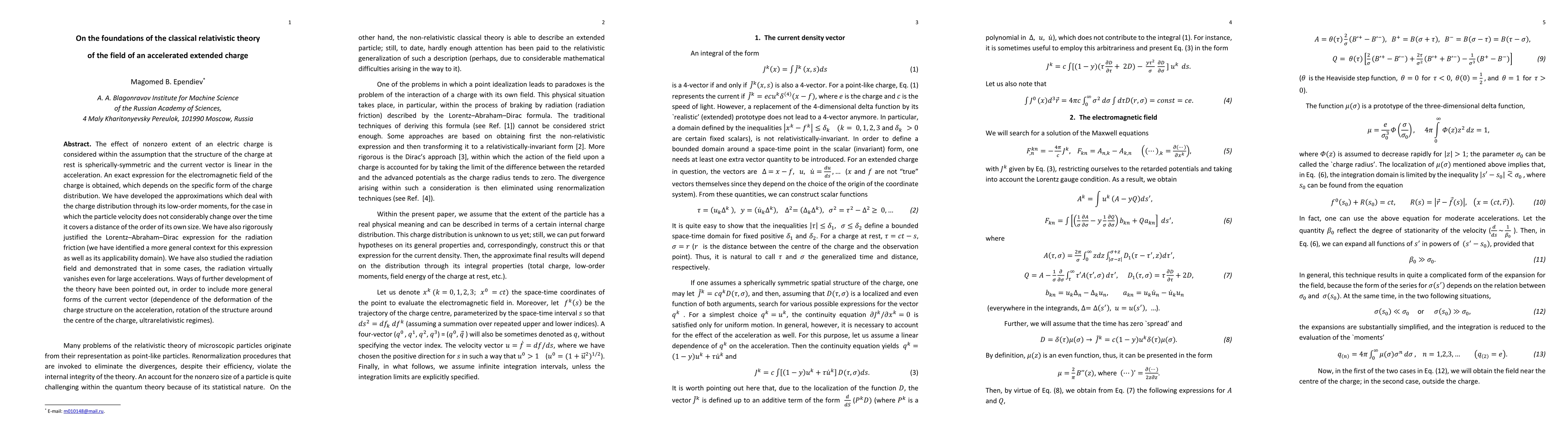 The effect of nonzero extent of an electric charge is considered within the assumption that the structure of the charge at rest is spherically-symmetric and the current vector is linear in the acceleration.