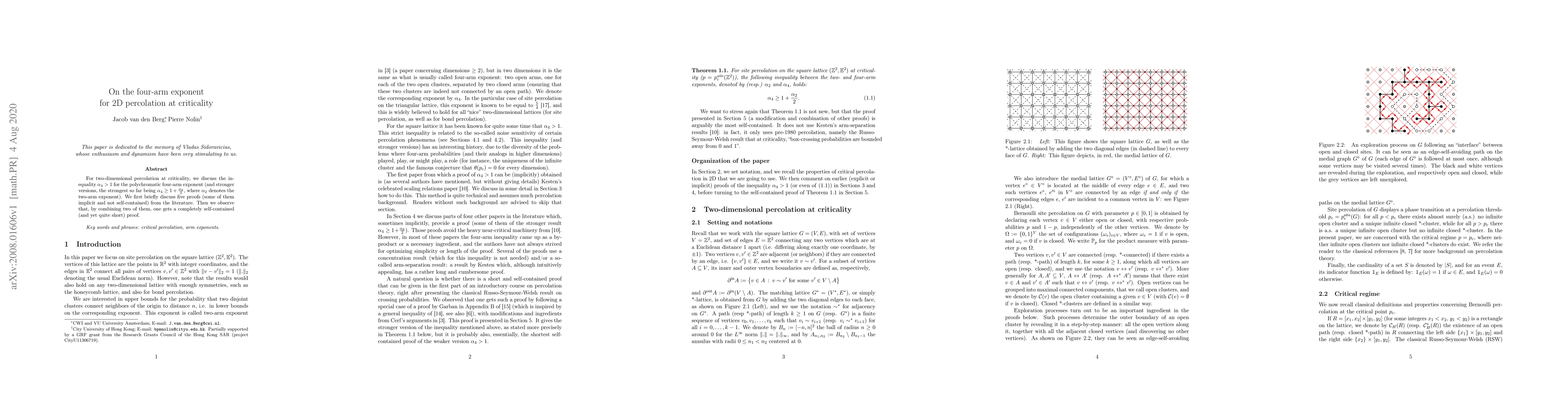 This paper proves that in two-dimensional critical percolation, the probability of four alternating colored paths (arms) extending from a point is sufficiently large, specifically greater than one, confirming important theoretical estimates. The authors improve understanding by combining existing proof techniques into a concise, self-contained argument.