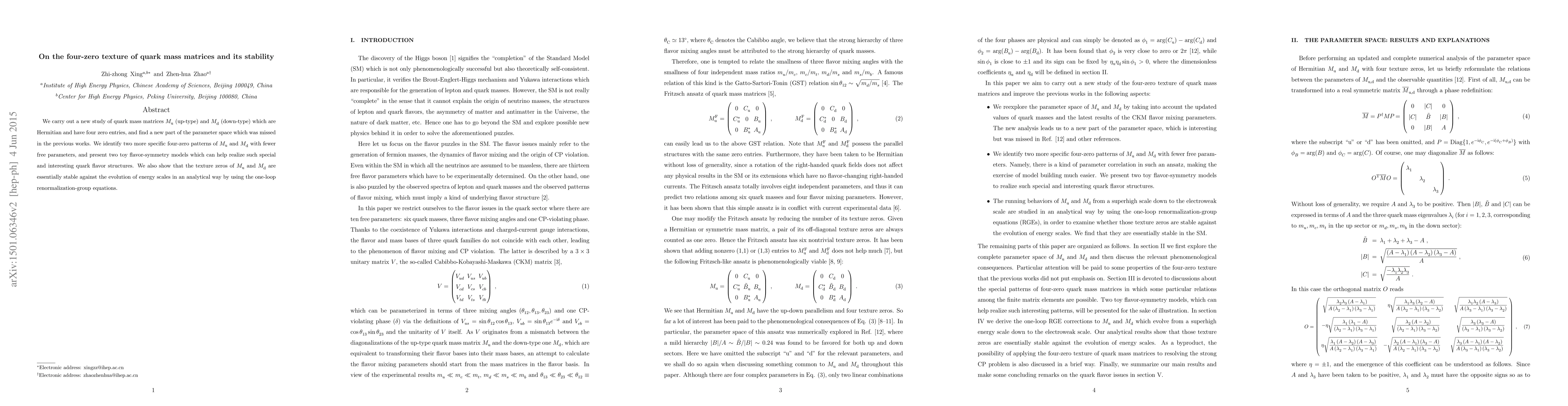 We carry out a new study of quark mass matrices $M^{}_{\rm u}$ (up-type) and $M^{}_{\rm d}$ (down-type) which are Hermitian and have four zero entries, and find a new part of the parameter space which was missed in the previous works. We identify two more specific four-zero patterns of $M^{}_{\rm u}$ and $M^{}_{\rm d}$ with fewer free parameters, and present two toy flavor-symmetry models which can help realize such special and interesting quark flavor structures. We also show that the texture zeros of $M^{}_{\rm u}$ and $M^{}_{\rm d}$ are essentially stable against the evolution of energy scales in an analytical way by using the one-loop renormalization-group equations.