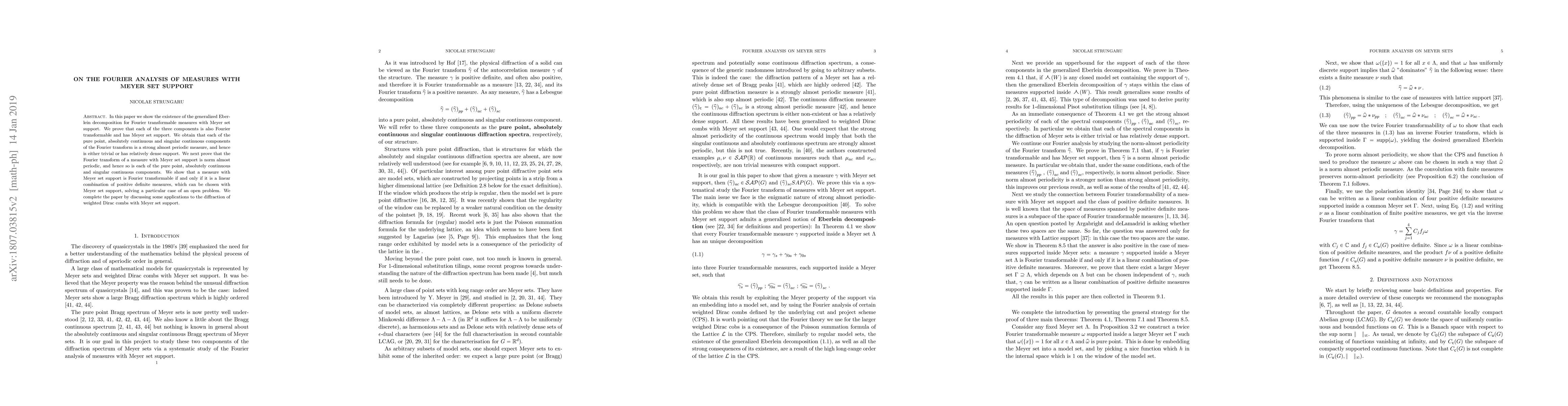 This paper establishes the generalized Eberlein decomposition for Fourier transformable measures with Meyer set support, proving that each component retains Meyer set support and is norm almost periodic. It also resolves a specific case of an open problem by showing that such measures are Fourier transformable if and only if they are linear combinations of positive definite measures with Meyer set support.
