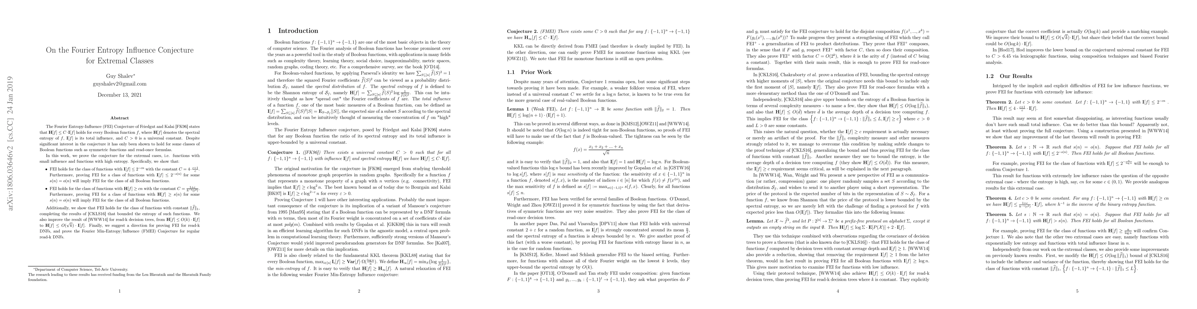 This paper proves the Fourier Entropy-Influence Conjecture for extremal Boolean functions, showing it holds for functions with low total influence and high entropy. It also improves existing bounds for read-k decision trees and suggests a path for proving the conjecture for read-k DNFs.