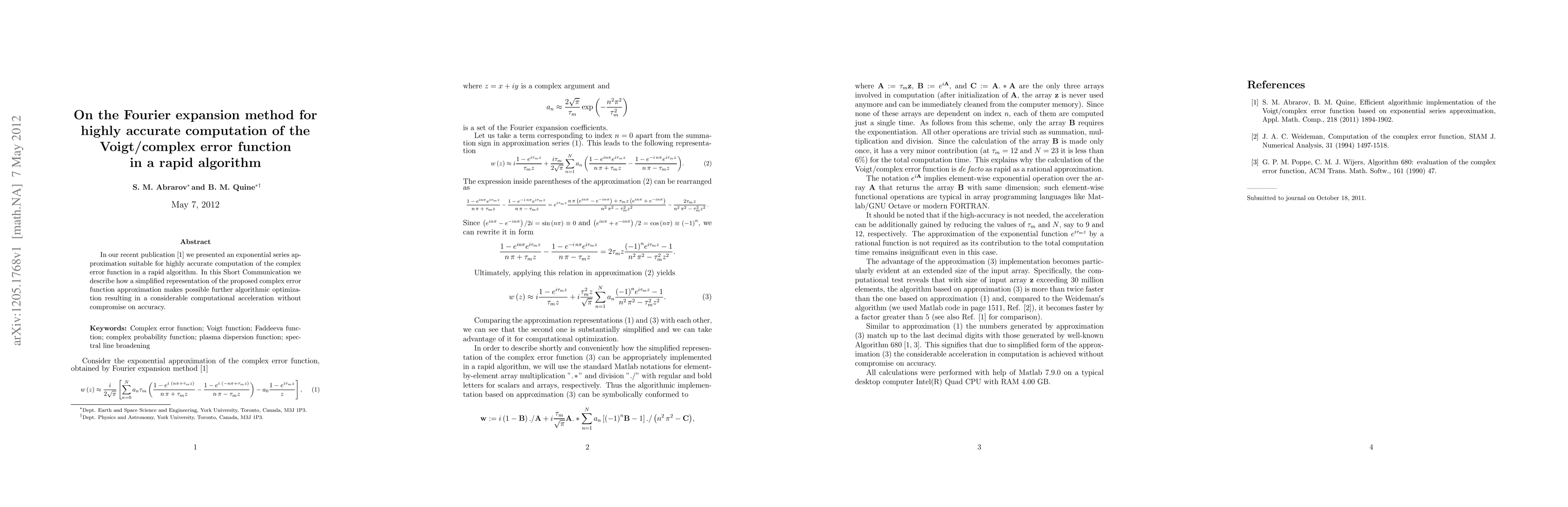 This paper presents a Fourier expansion method for rapid computation of the Voigt/complex error function, optimizing an earlier exponential series approximation to achieve significant speedups while maintaining high accuracy. The simplified representation allows for algorithmic enhancements without sacrificing precision.