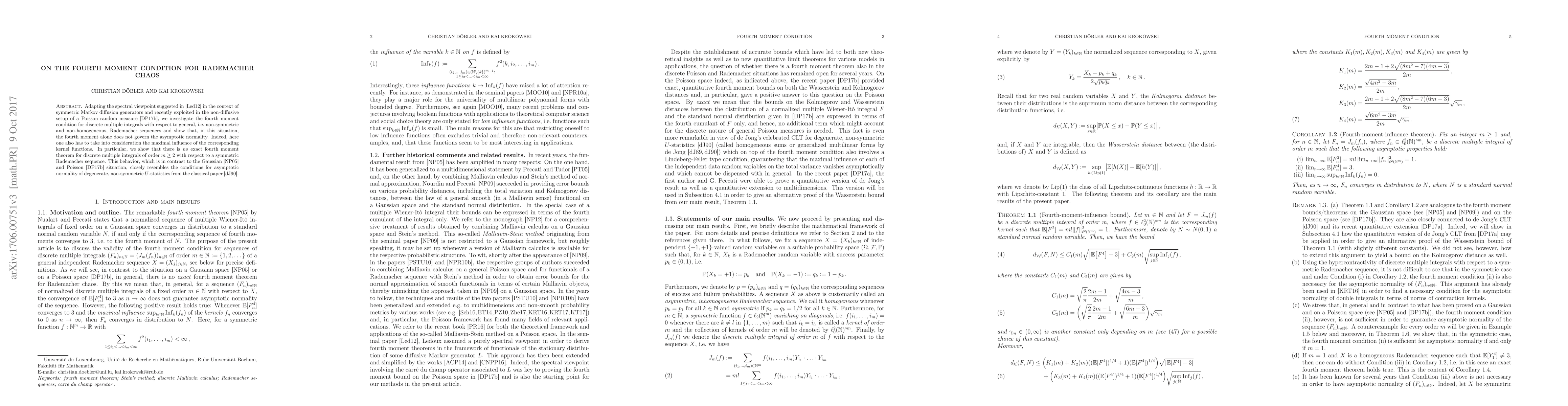 Adapting the spectral viewpoint suggested in Ledoux (2012) in the context of symmetric Markov diffusion generators and recently exploited in the non-diffusive setup of a Poisson random measure by D\"obler and Peccati (2017), we investigate the fourth moment condition for discrete multiple integrals with respect to general, i.e.\ non-symmetric and non-homogeneous, Rademacher sequences and show that, in this situation, the fourth moment alone does not govern the asymptotic normality. Indeed, here one also has to take into consideration the maximal influence of the corresponding kernel functions. In particular, we show that there is no exact fourth moment theorem for discrete multiple integrals of order $m\geq2$ with respect to a symmetric Rademacher sequence. This behavior, which is in contrast to the Gaussian (see Nualart and Peccati (2005)) and Poisson (see D\"obler and Peccati (2017)) situation, closely resembles the conditions for asymptotic normality of degenerate, non-symmetric $U$-statistics from the classical paper by de Jong (1990).