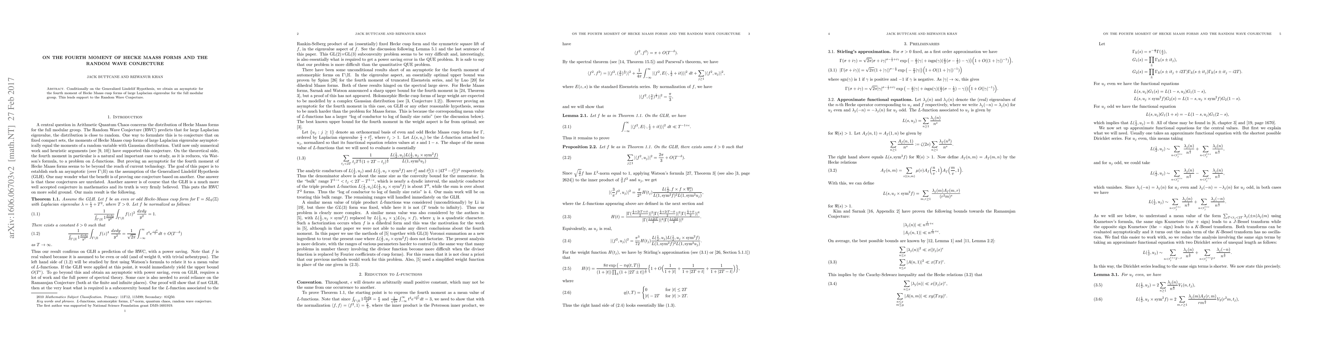 This paper provides an asymptotic for the fourth moment of Hecke Maass cusp forms under the Generalized Lindel\"of Hypothesis, supporting the Random Wave Conjecture. The results apply to forms with large Laplacian eigenvalues for the full modular group.