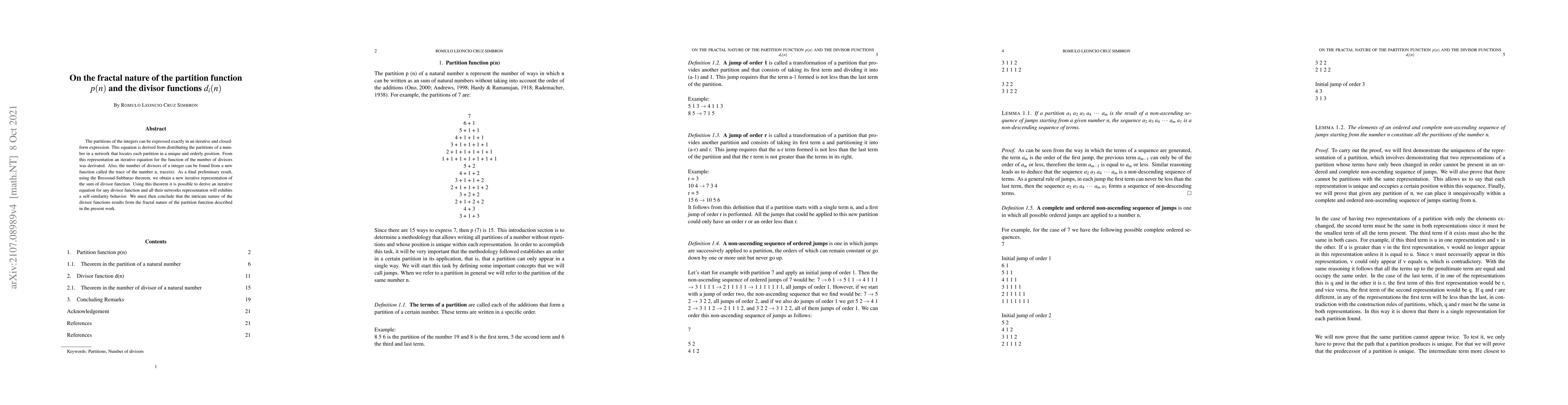 The partitions of the integers can be expressed exactly in an iterative and closed-form expression. This equation is derived from distributing the partitions of a number in a network that locates each partition in a unique and orderly position. From this representation an iterative equation for the function of the number of divisors was derivated. Also, the number of divisors of a integer can be found from a new function called the trace of the number n, trace(n). As a final preliminary result, using the Bressoud-Subbarao theorem, we obtain a new iterative representation of the sum of divisor function. Using this theorem it is possible to derive an iterative equation for any divisor function and all their networks representation will exhibits a self-similarity behavior. We must then conclude that the intricate nature of the divisor functions results from the fractal nature of the partition function described in the present work.