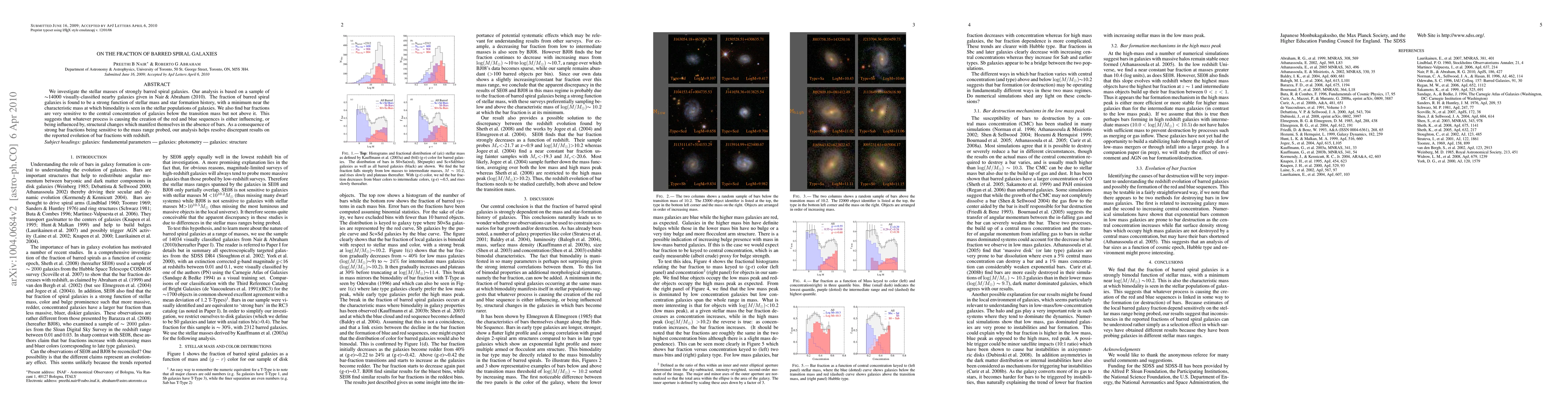 We investigate the stellar masses of strongly barred spiral galaxies. Our analysis is based on a sample of ~14000 visually-classified nearby galaxies given in Nair & Abraham 2010(a). The fraction of barred spiral galaxies is found to be a strong function of stellar mass and star formation history, with a minimum near the characteristic mass at which bimodality is seen in the stellar populations of galaxies. We also find bar fractions are very sensitive to the central concentration of galaxies below the transition mass but not above it. This suggests that whatever process is causing the creation of the red and blue sequences is either influencing, or being influenced by, structural changes which manifest themselves in the absence of bars. As a consequence of strong bar fractions being sensitive to the mass range probed, our analysis helps resolve discrepant results on the reported evolution of bar fractions with redshift.