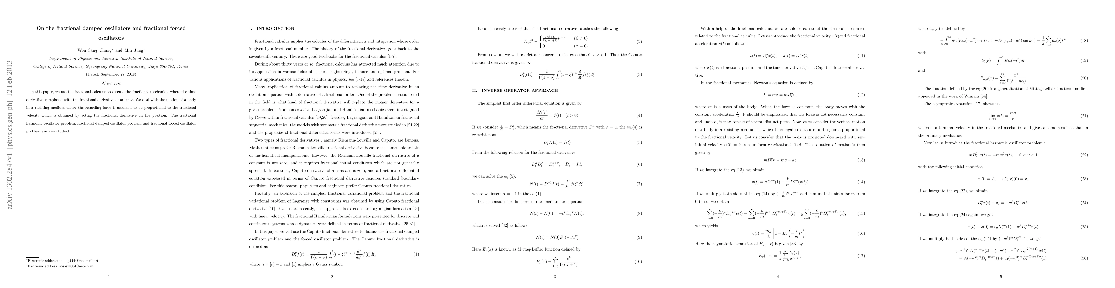 In this paper, we use the fractional calculus to discuss the fractional mechanics, where the time derivative is replaced with the fractional derivative of order $\nu$. We deal with the motion of a body in a resisting medium where the retarding force is assumed to be proportional to the fractional velocity which is obtained by acting the fractional derivative on the position. The fractional harmonic oscillator problem, fractional damped oscillator problem and fractional forced oscillator problem are also studied.