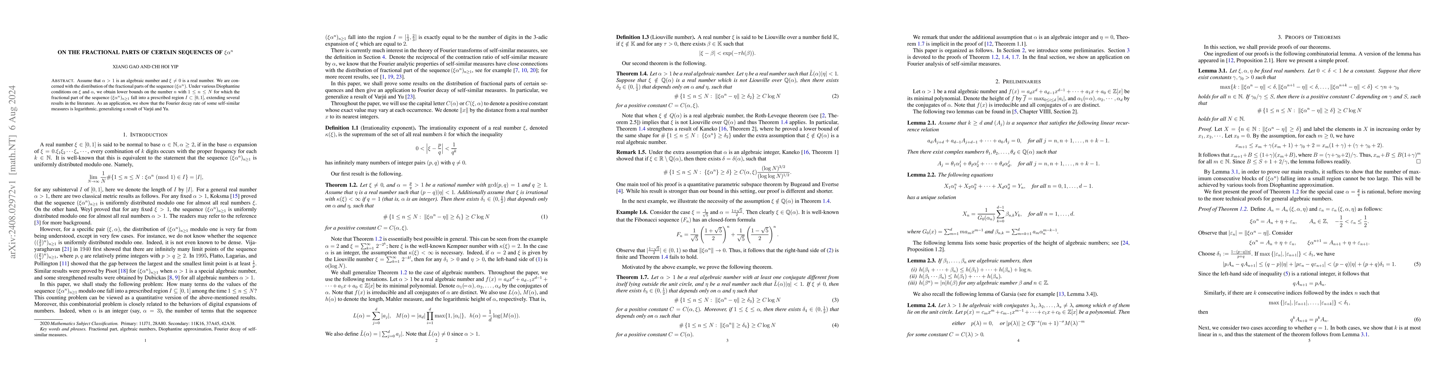This paper investigates the distribution of fractional parts of sequences generated by $(\xi \alpha^{n})$ where $\alpha$ is an algebraic number greater than 1 and $\xi$ is a non-zero real number. It establishes lower bounds for $n$ such that the fractional parts fall into a specified interval under various Diophantine conditions, extending existing results. As an application, it demonstrates that the Fourier decay rate of certain self-similar measures is logarithmic, generalizing prior work.