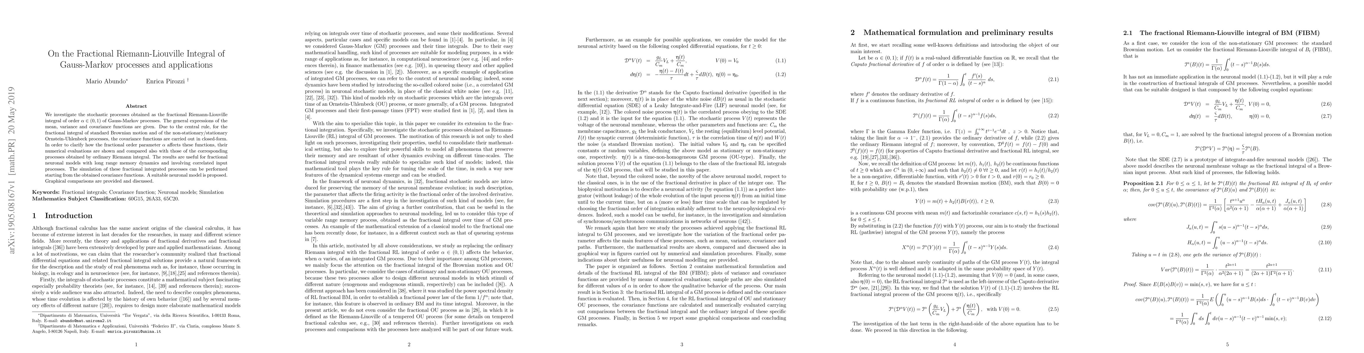 We investigate the stochastic processes obtained as the fractional Riemann-Liouville integral of order $\alpha \in (0,1)$ of Gauss-Markov processes. The general expressions of the mean, variance and covariance functions are given. Due to the central rule, for the fractional integral of standard Brownian motion and of the non-stationary/stationary Ornstein-Uhlenbeck processes, the covariance functions are carried out in closed-form. In order to clarify how the fractional order parameter $\alpha$ affects these functions, their numerical evaluations are shown and compared also with those of the corresponding processes obtained by ordinary Riemann integral. The results are useful for fractional neuronal models with long range memory dynamics and involving correlated input processes. The simulation of these fractional integrated processes can be performed starting from the obtained covariance functions. A suitable neuronal model is proposed. Graphical comparisons are provided and discussed.