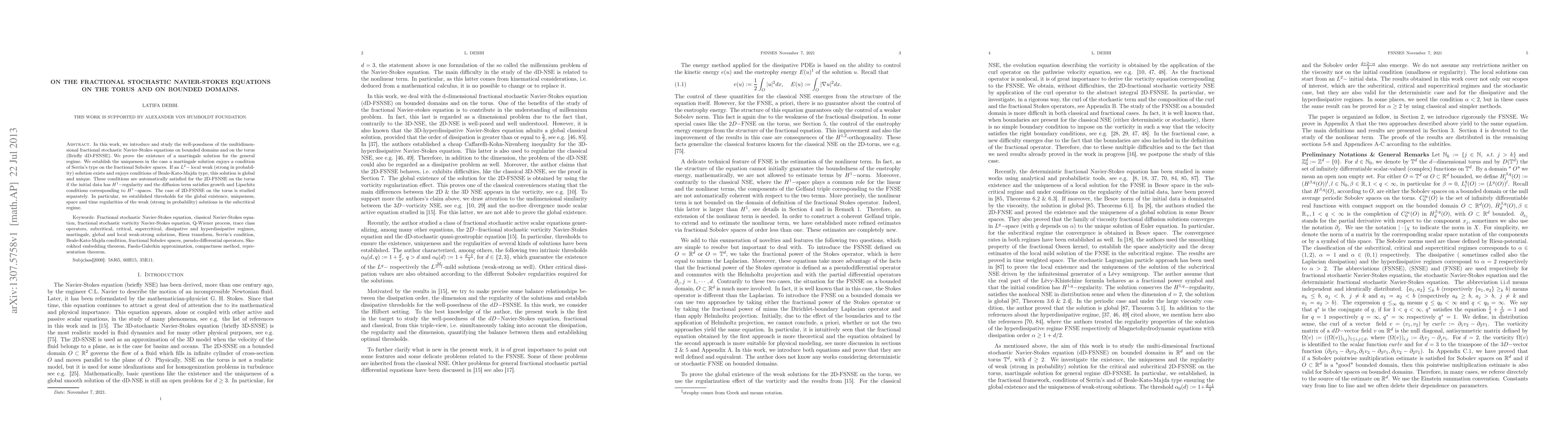 In this work, we introduce and study the well-posedness of the multidimensional fractional stochastic Navier-Stokes equations on bounded domains and on the torus (Briefly dD-FSNSE). We prove the existence of a martingale solution for the general regime. We establish the uniqueness in the case a martingale solution enjoys a condition of Serrin's type on the fractional Sobolev spaces. If an $L^2-$ local weak (strong in probability) solution exists and enjoys conditions of Beale-Kato-Majda type, this solution is global and unique. These conditions are automatically satisfied for the 2D-FSNSE on the torus if the initial data has $ H^1-$regularity and the diffusion term satisfies growth and Lipschitz conditions corresponding to $ H^1-$spaces. The case of 2D-FSNSE on the torus is studied separately. In particular, we established thresholds for the global existence, uniqueness, space and time regularities of the weak (strong in probability) solutions in the subcritical regime.