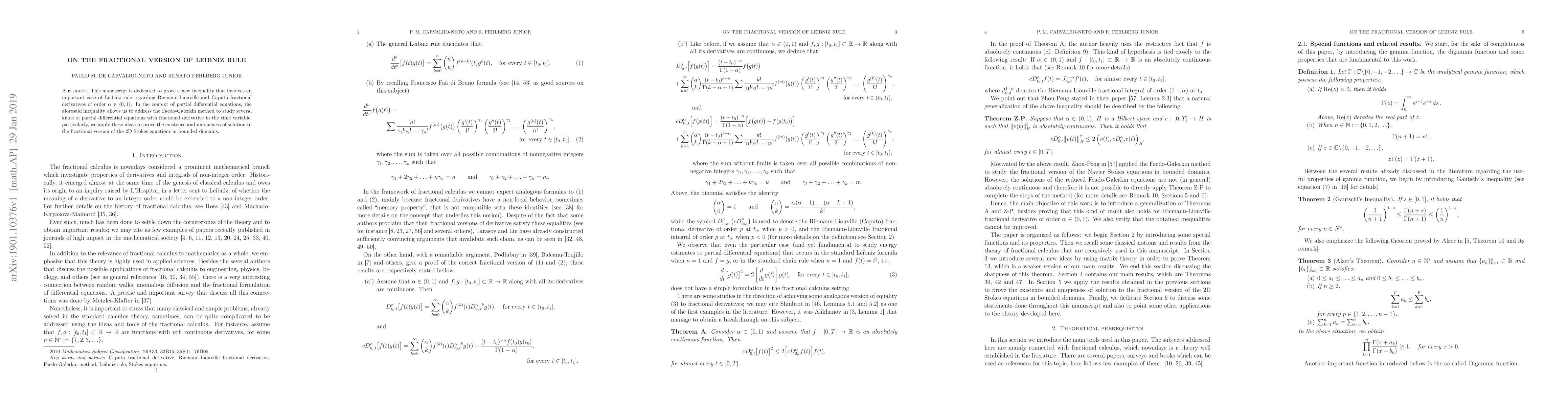 This paper proves a new inequality for fractional derivatives using the Leibniz rule, specifically for Riemann-Liouville and Caputo derivatives. It applies this inequality to the Faedo-Galerkin method for solving partial differential equations with fractional derivatives, demonstrating existence and uniqueness of solutions to the 2D fractional Stokes equations in bounded domains.