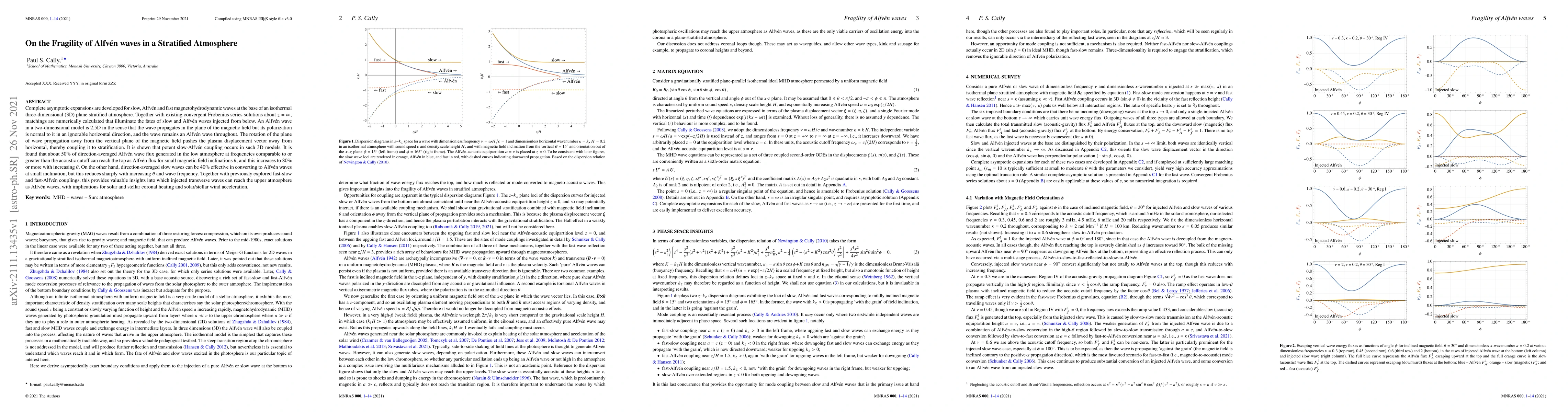 This paper develops asymptotic expansions for Alfvén and slow magnetohydrodynamic waves in a stratified atmosphere, showing that Alfvén waves maintain their characteristics despite rotation. It finds that 50% of Alfvén wave flux reaches the upper atmosphere for small magnetic inclinations, increasing to over 80% with greater inclinations, while slow waves convert to Alfvén waves less effectively. This research offers insights into coronal heating and wind acceleration in solar and stellar atmospheres.