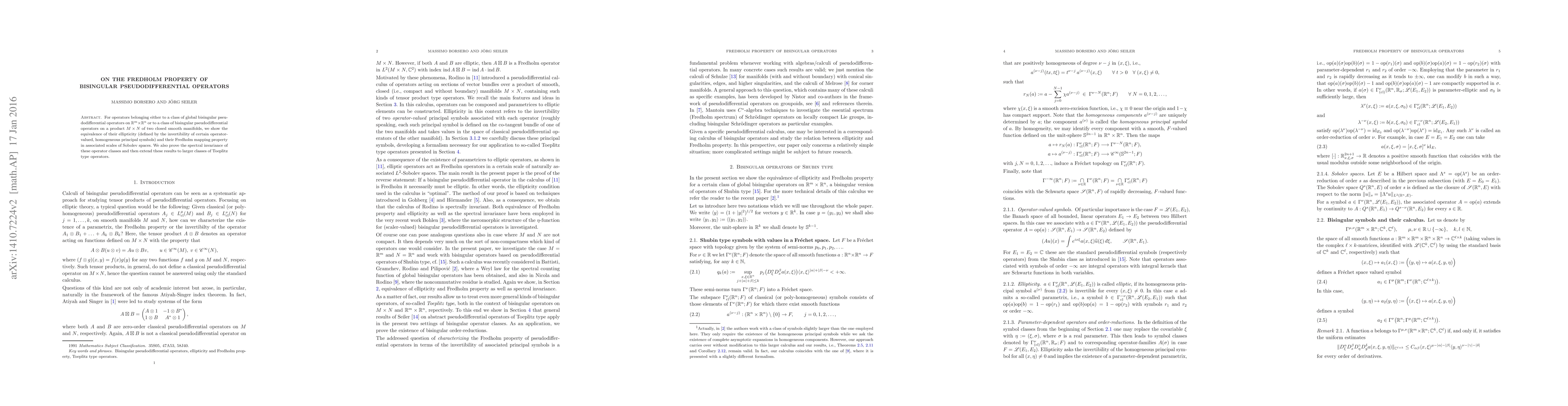 For operators belonging either to a class of global bisingular pseudodifferential operators on $R^m \times R^n$ or to a class of bisingular pseudodifferential operators on a product $M \times N$ of two closed smooth manifolds, we show the equivalence of their ellipticity (defined by the invertibility of certain associated homogeneous principal symbols) and their Fredholm mapping property in associated scales of Sobolev spaces. We also prove the spectral invariance of these operator classes and then extend these results to the even larger classes of Toeplitz type operators.